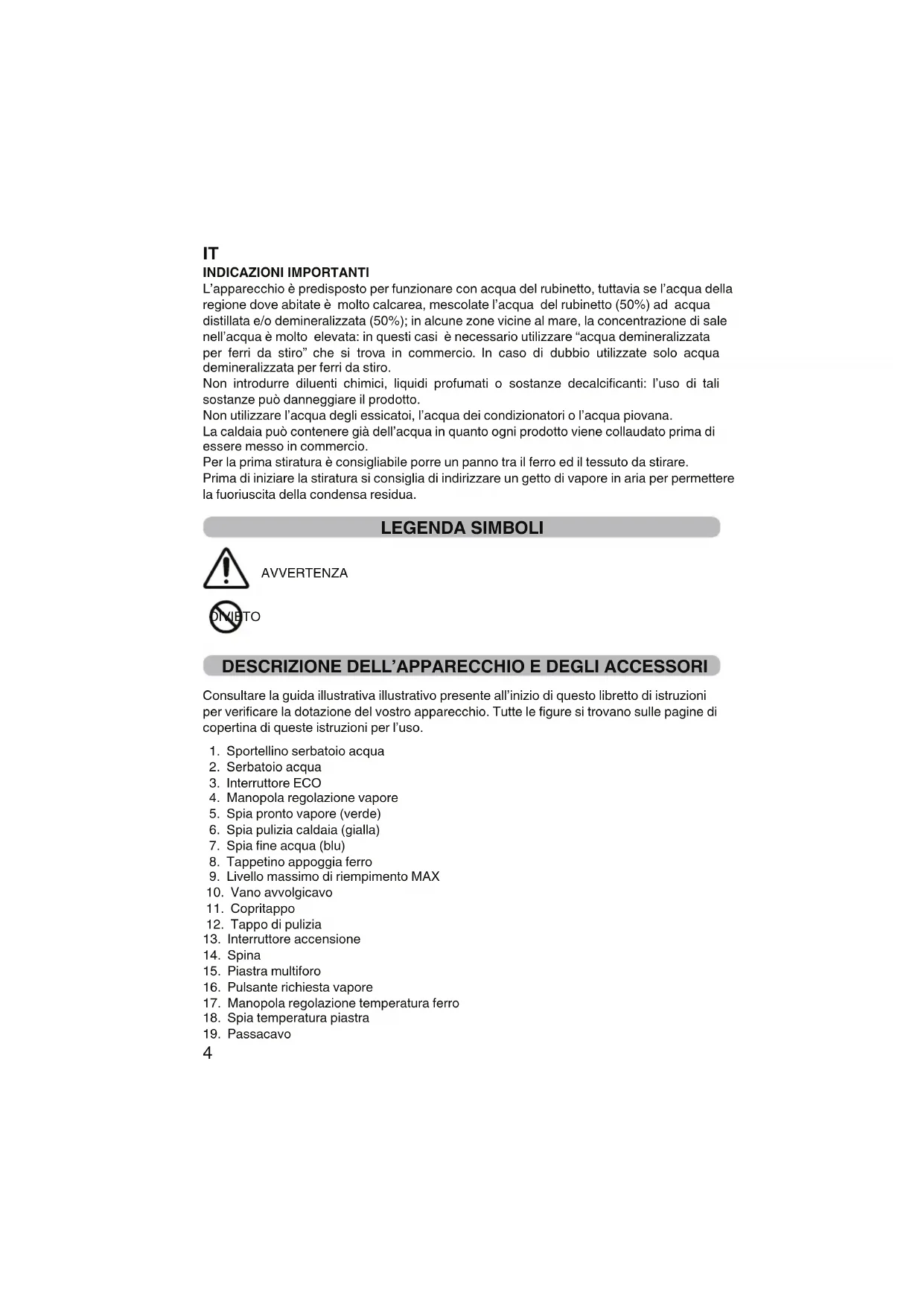%$*%K+9%)$%'%6()G!+$!%' L’apparecchio è predisposto per funzionare con acqua del rubinetto, tuttavia se l’acqua della regione dove abitate è molto calcarea, mescolate l’acqua del rubinetto (50%) ad acqua distillata e/o demineralizzata (50%); in alcune zone vicine al mare, la concentrazione di sale nell’acqua è molto elevata: in questi casi è necessario utilizzare “acqua demineralizzata per ferri da stiro” che si trova in commercio. In caso di dubbio utilizzate solo acqua demineralizzata per ferri da stiro. Non introdurre diluenti chimici, liquidi profumati o sostanze decalcificanti: l’uso di tali sostanze può danneggiare il prodotto. Non utilizzare l’acqua degli essicatoi, l’acqua dei condizionatori o l’acqua piovana. La caldaia può contenere già dell’acqua in quanto ogni prodotto viene collaudato prima di essere messo in commercio. Per la prima stiratura è consigliabile porre un panno tra il ferro ed il tessuto da stirare. Prima di iniziare la stiratura si consiglia di indirizzare un getto di vapore in aria per permettere la fuoriuscita della condensa residua. LEGENDA SIMBOLI FGGAHIAJ:F DIVIETO *"8KG%9%)$"'*"::L+((+G"KK#%)'"'*"h:%'+KK"88)G% Consultare la guida illustrativa illustrativo presente all’inizio di questo libretto di istruzioni per verificare la dotazione del vostro apparecchio. Tutte le figure si trovano sulle pagine di copertina di queste istruzioni per l’uso.