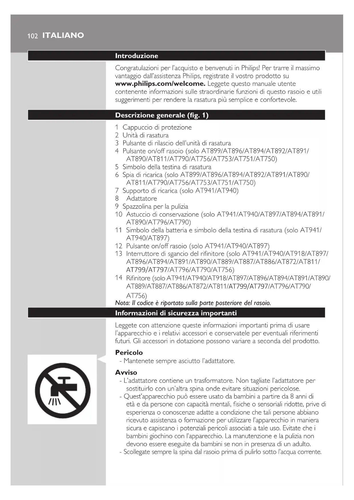 Rinitore (solo AT941/AT940/AT918/AT897/AT896/AT894/AT891/AT890/ AT889/AT887/AT886/AT872/AT811/AT799/AT797/AT796/AT790/ AT756) Nota: Il codice è riportato sulla parte posteriore del rasoio. Informazioni di sicurezza importanti Leggete con attenzione queste informazioni importanti prima di usare l’apparecchio e i relativi accessori e conservatele per eventuali riferimenti futuri. Gli accessori in dotazione possono variare a seconda del prodotto. Pericolo - Mantenete sempre asciutto l’adattatore. Avviso - L’adattatore contiene un trasformatore. Non tagliate l’adattatore per sostituirlo con un’altra spina onde evitare situazioni pericolose. - Quest’apparecchio può essere usato da bambini a partire da 8 anni di età e da persone con capacità mentali, siche o sensoriali ridotte, prive di esperienza o conoscenze adatte a condizione che tali persone abbiano ricevuto assistenza o formazione per utilizzare l’apparecchio in maniera sicura e capiscano i potenziali pericoli associati a tale uso. Evitate che i bambini giochino con l’apparecchio. La manutenzione e la pulizia non devono essere eseguite da bambini se non in presenza di un adulto. - Scollegate sempre la spina dal rasoio prima di pulirlo sotto l’acqua corrente. ITALIANO- Controllate sempre l’apparecchio e i rispettivi accessori prima di utilizzarlo. Non usate l’apparecchio o i rispettivi accessori se danneggiati, in quanto potrebbero causare lesioni. Se una parte risulta danneggiata, sostituitela sempre con un ricambio originale. Attenzione - Non immergete mai il supporto di ricarica nell’acqua né sciacquarlo sotto l’acqua corrente. - Utilizzate questo apparecchio per lo scopo previsto come indicato nel manuale dell’utente. - Per motivi igienici, l’apparecchio deve essere usato da una sola persona. - Non utilizzate l’adattatore in prossimità o in prese a muro che contengono o hanno contenuto deodoranti per auto elettrici, per evitare danni irreparabili all’adattatore. - Non usate aria compressa, prodotti o sostanze abrasive o detergenti aggressivi, come benzina o acetone, per pulire l’apparecchio. - Quando sciacquate l’apparecchio, potreste riscontrare una fuoriuscita di alcune gocce d’acqua dalla presa che si trova nella parte inferiore del rasoio. Si tratta di un fenomeno del tutto normale e sicuro, in quanto tutte le parti elettroniche sono racchiuse nel gruppo di alimentazione sigillato, all’interno del rasoio. Campi elettromagnetici (EMF) - Questo apparecchio Philips è conforme a tutti gli standard e alle norme relativi all’esposizione ai campi elettromagnetici. Indicazioni generali - Questo rasoio è impermeabile. Può essere usato in bagno o sotto la doccia e pulito sotto l’acqua corrente. Per ragioni di sicurezza, il rasoio può quindi essere utilizzato solo senza lo. - L’apparecchio funziona con tensioni comprese fra 100 e 240 V. - L’adattatore trasforma la tensione a 100-240 volt in una tensione più bassa e sicura inferiore ai 24 volt. - Livello di rumorosità massimo: Lc = 69 dB(A) Come ricaricare l’apparecchio Nota: Non è possibile utilizzare il rasoio quando questo è collegato alla presa di corrente. La prima volta che lo utilizzate o dopo un lungo periodo di non utilizzo, ricaricate l’apparecchio no a quando le spie non lampeggiano. Consultate la tabella riportata in basso per conoscere il tempo di ricarica del rasoio. Tempo di ricarica 1 ora 8 ore AT941, AT940, AT918 AT897, AT896, AT894 AT892, AT891, AT890 AT889, AT887, AT886 AT899, AT896, AT872, AT799, AT797, AT796, AT790, AT770, AT756, AT753, AT751, AT750 AT811 ITALIANO 103Il tempo di rasatura potrebbe variare rispetto a quello indicato nella tabella riportata in basso a seconda delle proprie abitudini, della pulizia personale e del tipo di barba. Minuti di rasatura 60 min. 50 min. 45 min. 40 min. AT941 AT899 AT790, AT756, AT753 AT940 AT897, AT894, AT892 AT891, AT890, AT811, AT799 AT896 AT751, AT750 Istruzioni di ricarica Batteria scarica - AT941/AT940/AT897: quando la batteria è quasi scarica (rimangono 5 minuti di rasatura al massimo), il simbolo della batteria arancione comincia a lampeggiare. Quando spegnete il rasoio elettrico, il simbolo della batteria arancione continua a lampeggiare per qualche secondo. - AT899, AT896, AT918, AT896, AT894, AT891, AT890, AT889, AT887, AT886, AT872, AT811, AT799, AT797, AT796, AT790, AT770, AT756,AT753, AT751, AT750: quando la batteria è quasi scarica (rimangono 5 minuti di rasatura al massimo), la spia di ricarica comincia a lampeggiare a luce arancione. Quando spegnete il rasoio, la spia di ricarica continua a lampeggiare a luce arancione per qualche secondo. Ricarica rapida (solo AT941, AT940, AT918, AT 897, AT896, AT894, AT891, AT890, AT889, AT887, AT886, AT811) - AT941/AT940/AT897: quando iniziate a caricare la batteria vuota, il simbolo della batteria lampeggia in arancione e bianco. Nota: quando il simbolo della batteria lampeggia in bianco e arancione, tendente più verso il bianco, potete eseguire una rasatura veloce di tre minuti. - AT918, AT896, AT894, AT891, AT890, AT889, AT887, AT886, AT811: quando iniziate a caricare la batteria vuota, la spia di ricarica lampeggia a luce arancione e verde in modo alternato. Nota: quando la spia di ricarica lampeggia in arancione e verde, tendente più verso il verde, potete eseguire una rasatura veloce di tre minuti. ITALIANO104Come ricaricare l’apparecchio - AT941/AT940/AT897: quando il rasoio è in carica, lampeggia il simbolo bianco della batteria. - AT899, AT896, AT872, AT799, AT797, AT796, AT790, AT770, AT756,AT753, AT751, AT750: quando l’apparecchio è in fase di ricarica, la spia di ricarica lampeggia a luce verde. Ricarica completa della batteria - AT941/AT940/AT897: quando la batteria è completamente carica, il simbolo bianco della batteria si accende a luce ssa. Nota: Dopo circa 30 minuti il simbolo della batteria si spegne per risparmiare energia. - AT899, AT896, AT918, AT896, AT894, AT891, AT890, AT889, A