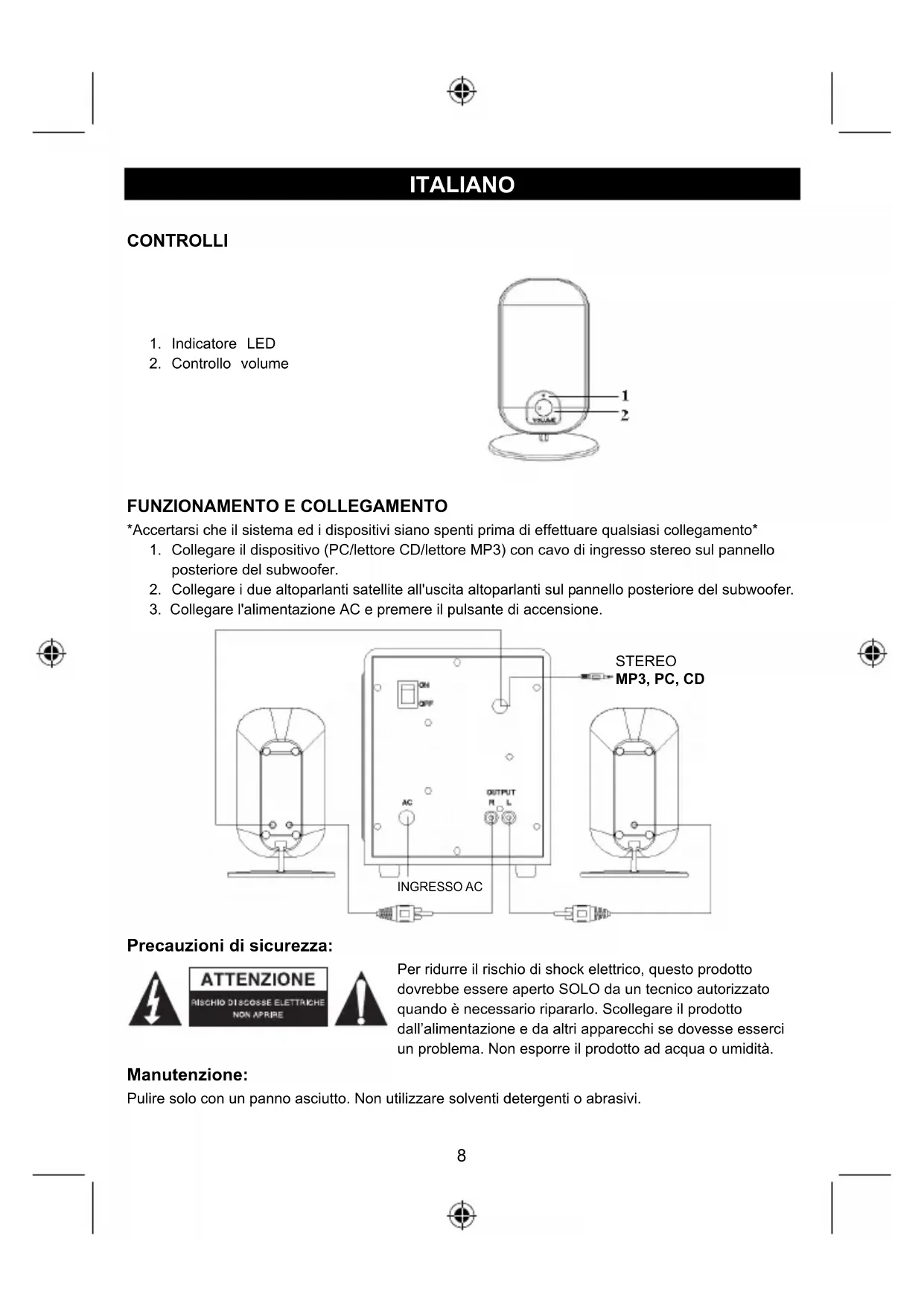 Precauzioni di sicurezza: Per ridurre il rischio di shock elettrico, questo prodotto dovrebbe essere aperto SOLO da un tecnico autorizzato quando è necessario ripararlo. Scollegare il prodotto dall’alimentazione e da altri apparecchi se dovesse esserci un problema. Non esporre il prodotto ad acqua o umidità. Manutenzione: Pulire solo con un panno asciutto. Non utilizzare solventi detergenti o abrasivi. STEREO MP3, PC, CD INGRESSO AC9 Garanzia: Non sarà accettata alcuna garanzia o responsabilità in relazione a cambiamenti e modifiche del prodotto o a danni determinati dall’uso non corretto del prodotto stesso. Generalità: - Il design e le caratteristiche tecniche sono soggetti a modifica senza necessità di preavviso. - Tutti i marchi a logo e i nomi di prodotto sono marchi commerciali o registrati dei rispettivi titolari e sono riconosciuti come tali in questo documento. - Questo manuale è stato redatto con cura. Tuttavia da esse non possono essere avanzati diritti. König Electronic non può accettare responsabilità per errori in questo manuale nè per eventuali conseguenze. - Tenere questo manuale e la confezione per riferimento futuro. Attenzione: Il prodotto è contrassegnato con questo simbolo, con il quale si indica che i prodotti elettrici ed elettronici non devono essere gettati insieme ai rifiuti domestici. Per questi prodotti esiste un sistema di raccolta differenziata.