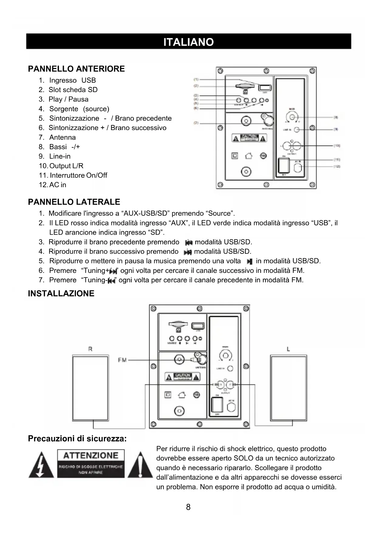 2. Il LED rosso indica modalità ingresso “AUX”, il LED verde indica modalità ingresso “USB”, il