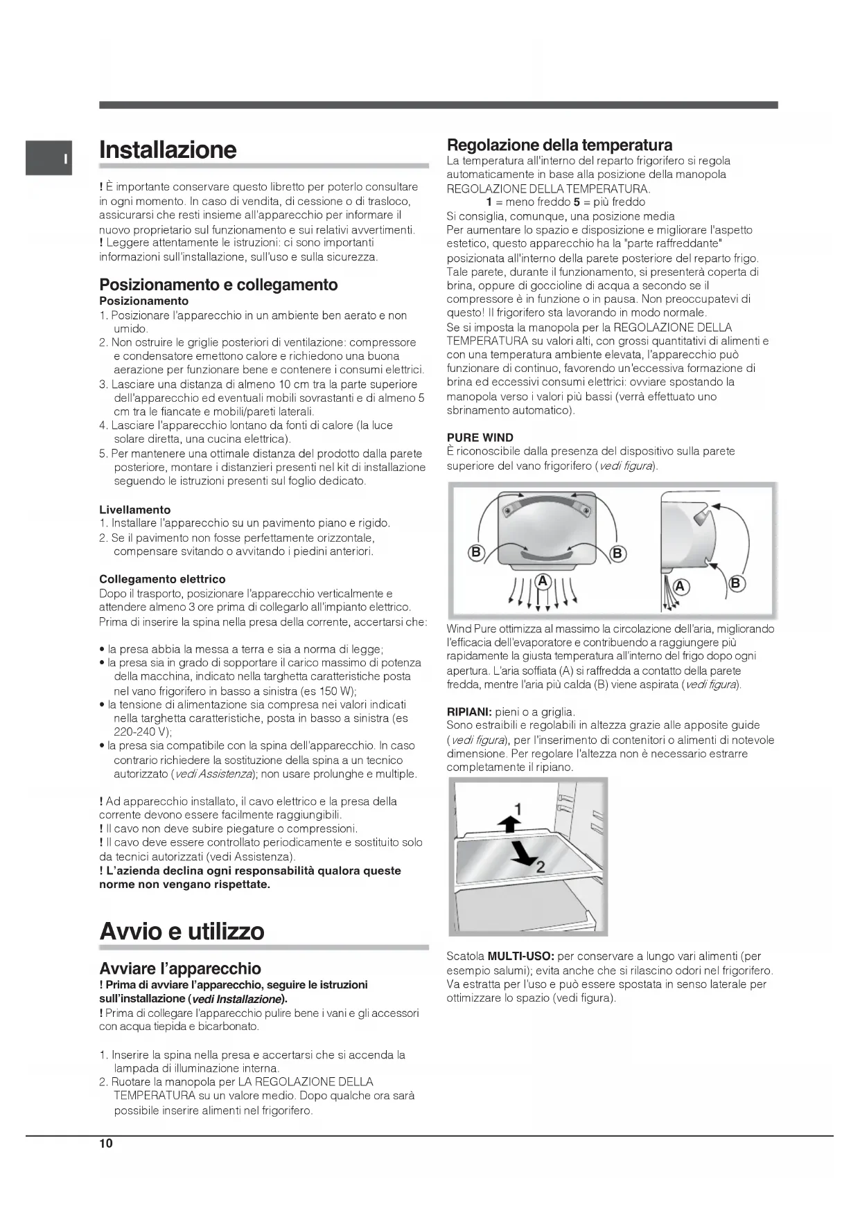 Wind Pure ottimizza al massimo la circolazione dell’aria, migliorandol’efficacia dell’evaporatore e contribuendo a raggiungere piùrapidamente la giusta temperatura all’interno del frigo dopo ogniapertura. L’aria soffiata (A) si raffredda a contatto della parete fredda, mentre l’aria più calda (B) viene aspirata (vedi figura). RIPIANI: pieni o a griglia.Sono estraibili e regolabili in altezza grazie alle apposite guide (vedi figura), per l’inserimento di contenitori o alimenti di notevole dimensione. Per regolare l’altezza non è necessario estrarrecompletamente il ripiano.Scatola MULTI-USO: per conservare a lungo vari alimenti (peresempio salumi); evita anche che si rilascino odori nel frigorifero.Va estratta per l’uso e può essere spostata in senso laterale perottimizzare lo spazio (vedi figura).I