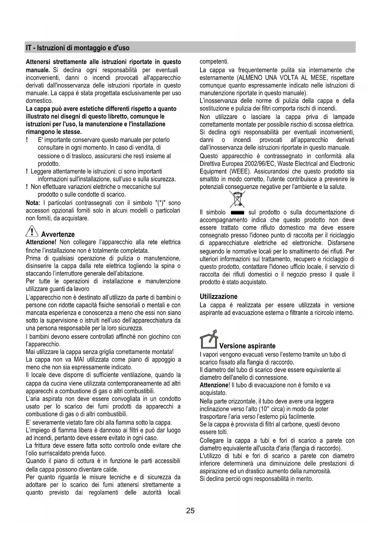 manuale. La cappa è stata progettata esclusivamente per uso