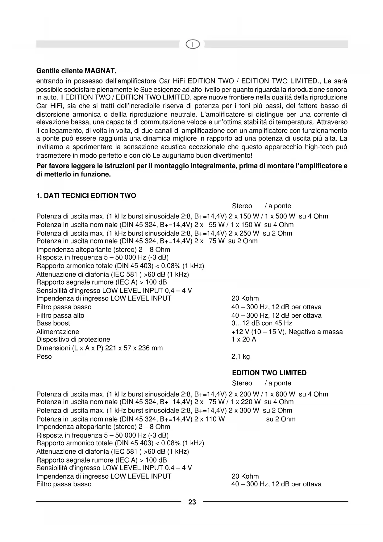 Gentile cliente MAGNAT, entrando in possesso dell’amplificatore Car HiFi EDITION TWO / EDITION TWO LIMITED., Le sará possibile soddisfare pienamente le Sue esigenze ad alto livello per quanto riguarda la riproduzione sonora in auto. Il EDITION TWO / EDITION TWO LIMITED. apre nuove frontiere nella qualitá della riproduzione Car HiFi, sia che si tratti dell’incredibile riserva di potenza per i toni piú bassi, del fattore basso di distorsione armonica o dellla riproduzione neutrale. L’amplificatore si distingue per una corrente di elevazione bassa, una capacitá di commutazione veloce e un’ottima stabilitá di temperatura. Attraverso il collegamento, di volta in volta, di due canali di amplificazione con un amplificatore con funzionamento a ponte puó essere raggiunta una dinamica migliore in rapporto ad una potenza di uscita piú alta. La invitiamo a sperimentare la sensazione acustica eccezionale che questo apparecchio high-tech puó trasmettere in modo perfetto e con ció Le auguriamo buon divertimento! Per favore leggere le istruzioni per il montaggio integralmente, prima di montare l’amplificatore e di metterlo in funzione.