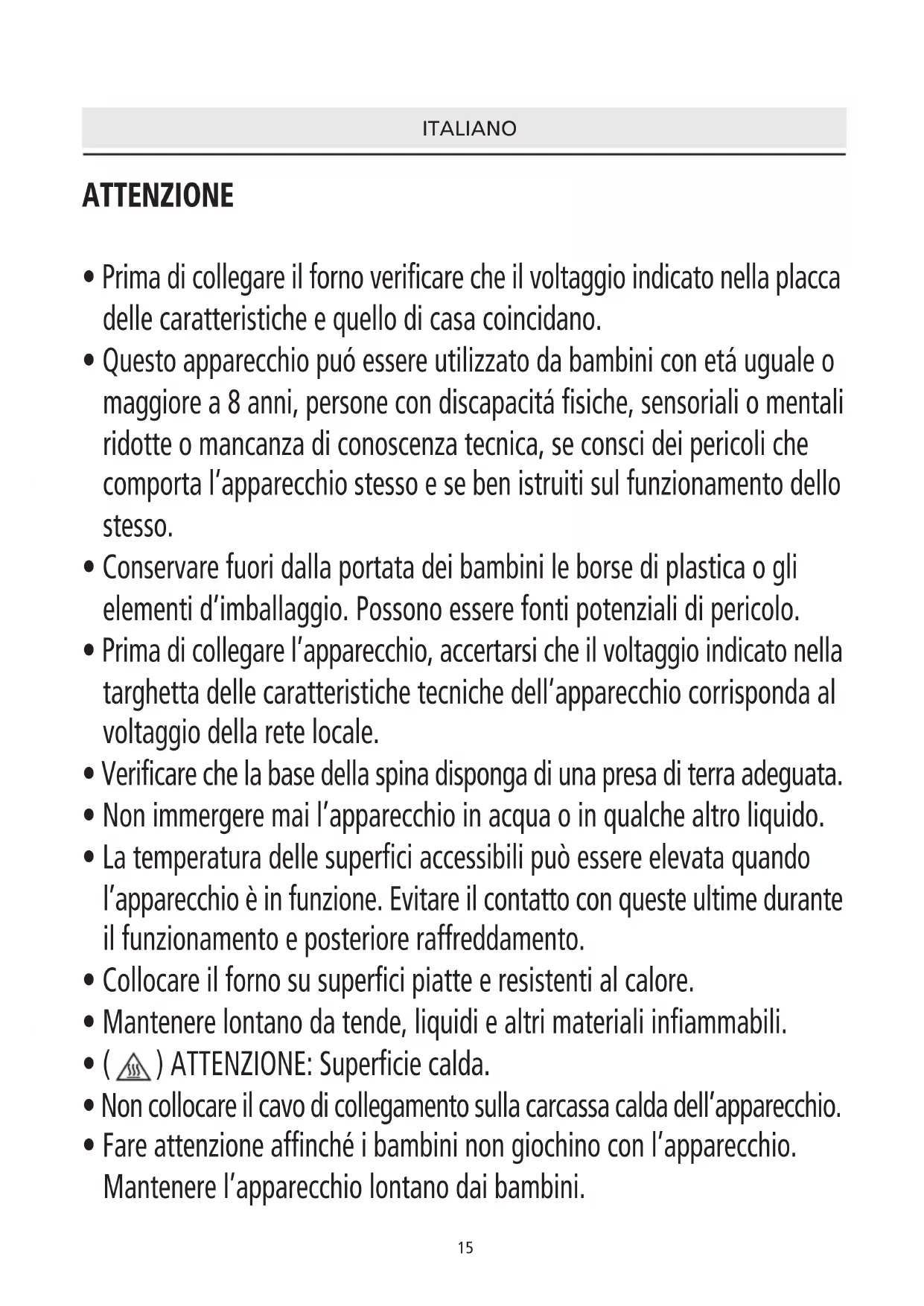 - Questo apparecchio puó essere utilizzato da bambini con etá uguale o maggiore a 8 anni, persone con discapacitá fisiche, sensoriali o mentali ridotte o mancanza di conoscenza tecnica, se consci dei pericoli che comporta l’apparecchio stesso e se ben istruiti sul funzionamento dello stesso.