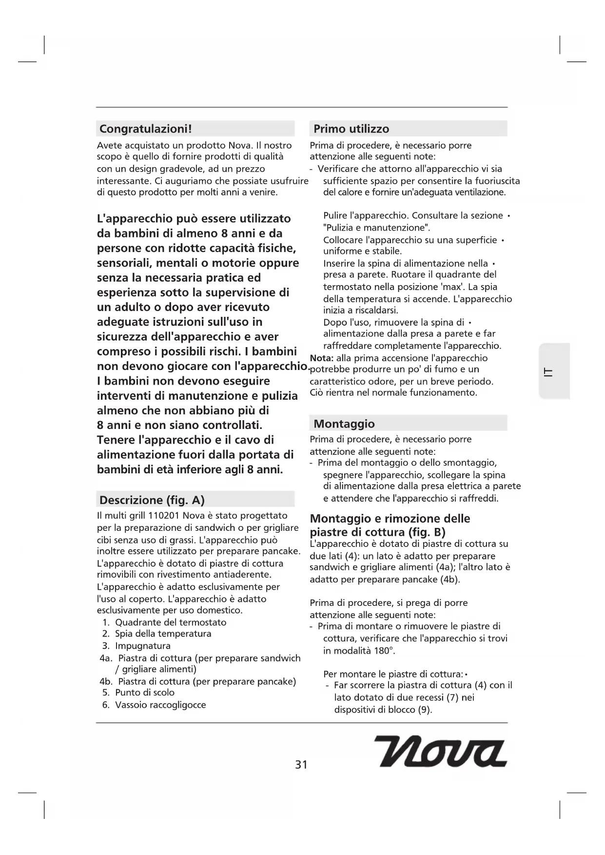 Congratulazioni! Avete acquistato un prodotto Nova. Il nostro scopo è quello di fornire prodotti di qualità con un design gradevole, ad un prezzo interessante. Ci auguriamo che possiate usufruire di questo prodotto per molti anni a venire. L'apparecchio può essere utilizzato da bambini di almeno 8 anni e da persone con ridotte capacità fisiche, sensoriali, mentali o motorie oppure senza la necessaria pratica ed esperienza sotto la supervisione di un adulto o dopo aver ricevuto adeguate istruzioni sull'uso in sicurezza dell'apparecchio e aver compreso i possibili rischi. I bambini non devono giocare con l'apparecchio. I bambini non devono eseguire interventi di manutenzione e pulizia almeno che non abbiano più di 8 anni e non siano controllati. Tenere l'apparecchio e il cavo di alimentazione fuori dalla portata di bambini di età inferiore agli 8 anni. Descrizione (fig. A) Il multi grill 110201 Nova è stato progettato per la preparazione di sandwich o per grigliare cibi senza uso di grassi. L'apparecchio può inoltre essere utilizzato per preparare pancake. L'apparecchio è dotato di piastre di cottura rimovibili con rivestimento antiaderente. L'apparecchio è adatto esclusivamente per l'uso al coperto. L'apparecchio è adatto esclusivamente per uso domestico.