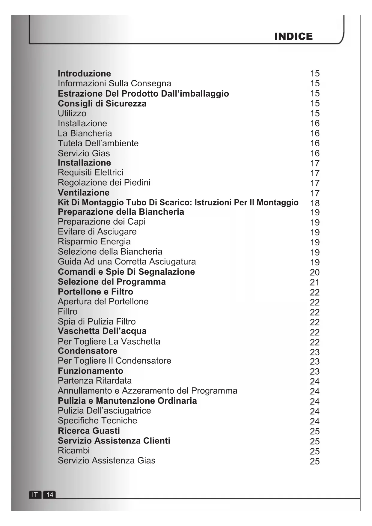 biancheria è pertanto opportuno lasciar raffreddare completamente la macchina. IT 15CONSIGLI DI SICUREZZA InstallazioneLa Biancheria ● Prima dell’uso, controllare che il prodotto non