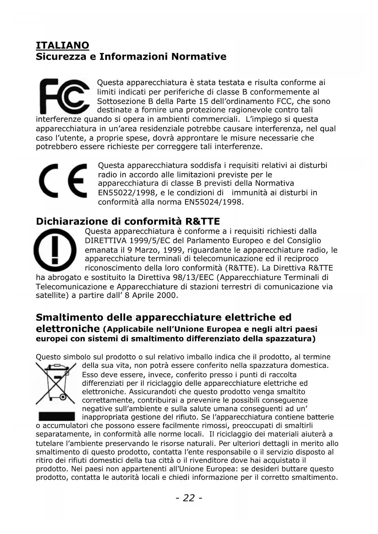 Hardware instalacija i dodatne informacije Za dodatne informacije o instalaciji, konfiguraciji i funkcijama kamere ili mrežnog video servera, molimo pogledajte upute za uporabu na INTELLINET instalacijskom CD-u.- 22 - ITALIANO Sicurezza e Informazioni Normative Questa apparecchiatura è stata testata e risulta conforme ai limiti indicati per periferiche di classe B conformemente al Sottosezione B della Parte 15 dell’ordinamento FCC, che sono destinate a fornire una protezione ragionevole contro tali interferenze quando si opera in ambienti commerciali. L’impiego si questa apparecchiatura in un’area residenziale potrebbe causare interferenza, nel qual caso l’utente, a proprie spese, dovrà approntare le misure necessarie che potrebbero essere richieste per correggere tali interferenze. Questa apparecchiatura soddisfa i requisiti relativi ai disturbi radio in accordo alle limitazioni previste per le apparecchiatura di classe B previsti della Normativa EN55022/1998, e le condizioni di immunità ai disturbi in conformità alla norma EN55024/1998. Dichiarazione di conformità R&TTE Questa apparecchiatura è conforme a i requisiti richiesti dalla DIRETTIVA 1999/5/EC del Parlamento Europeo e del Consiglio emanata il 9 Marzo, 1999, riguardante le apparecchiature radio, le apparecchiature terminali di telecomunicazione ed il reciproco riconoscimento della loro conformità (R&TTE). La Direttiva R&TTE ha abrogato e sostituito la Direttiva 98/13/EEC (Apparecchiature Terminali di Telecomunicazione e Apparecchiature di stazioni terrestri di comunicazione via satellite) a partire dall’ 8 Aprile 2000. Smaltimento delle apparecchiature elettriche ed elettroniche (Applicabile nell’Unione Europea e negli altri paesi europei con sistemi di smaltimento differenziato della spazzatura) Questo simbolo sul prodotto o sul relativo imballo indica che il prodotto, al termine della sua vita, non potrà essere conferito nella spazzatura domestica. Esso deve essere, invece, conferito presso i punti di raccolta differenziati per il riciclaggio delle apparecchiature elettriche ed elettroniche. Assicurandoti che questo prodotto venga smaltito correttamente, contribuirai a prevenire le possibili conseguenze negative sull’ambiente e sulla salute umana conseguenti ad un’ inappropriata gestione del rifiuto. Se l’apparecchiatura contiene batterie o accumulatori che possono essere facilmente rimossi, preoccupati di smaltirli separatamente, in conformità alle norme locali. Il riciclaggio dei materiali aiuterà a tutelare l’ambiente preservando le risorse naturali. Per ulteriori dettagli in merito allo smaltimento di questo prodotto, contatta l’ente responsabile o il servizio disposto al ritiro dei rifiuti domestici della tua città o il rivenditore dove hai acquistato il prodotto. Nei paesi non appartenenti all’Unione Europea: se desideri buttare questo prodotto, contatta le autorità locali e chiedi informazione per il corretto smaltimento.- 23 -