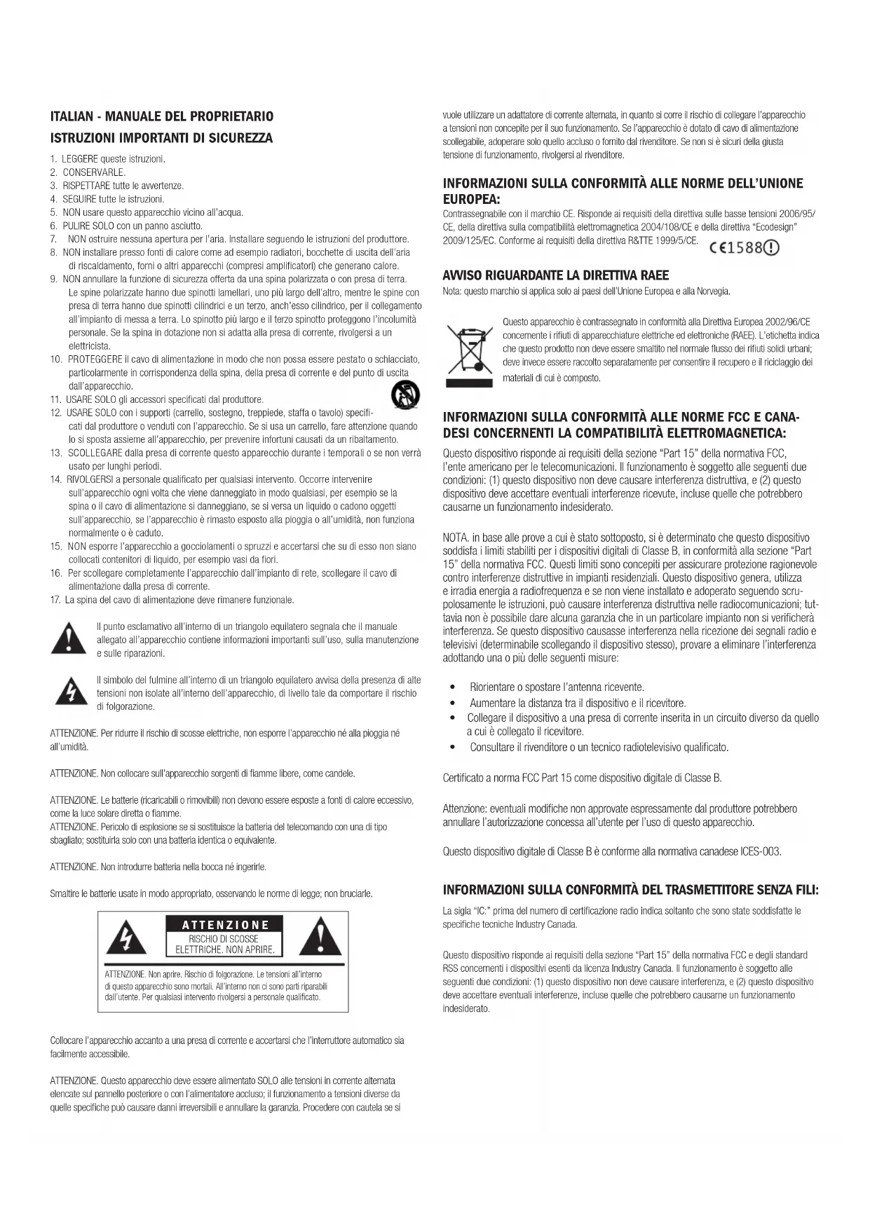 ATTENZIONE. Per ridurre il rischio di scosse elettriche, non esporre l’apparecchio né alla pioggia né
