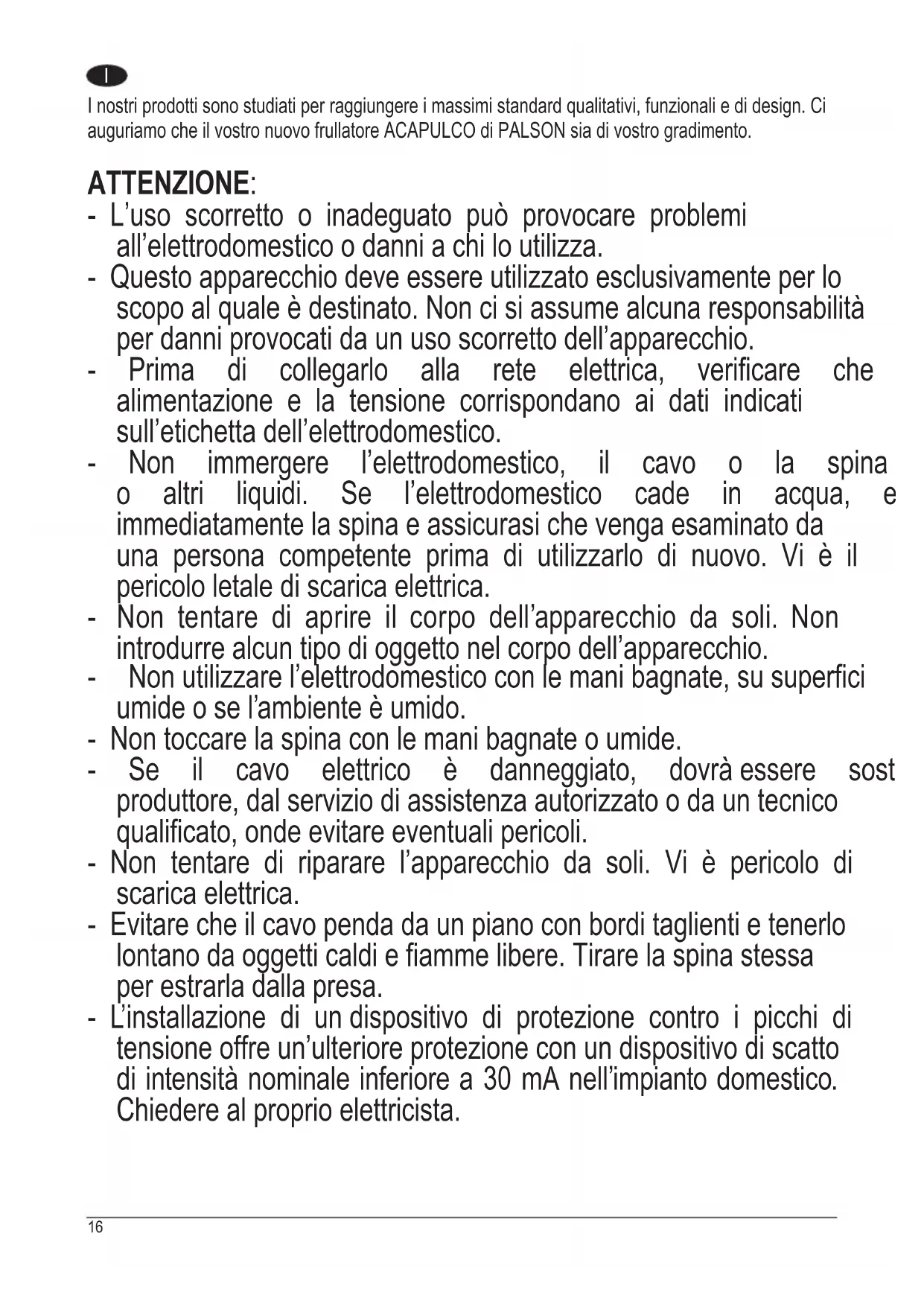 Scarica le istruzioni per il tuo Frullatore in formato PDF gratuitamente! Trova il tuo manuale Acapulco - PALSON e riprendi in mano il tuo dispositivo elettronico. In questa pagina sono pubblicati tutti i documenti necessari per l'utilizzo del tuo dispositivo. Acapulco del marchio PALSON.