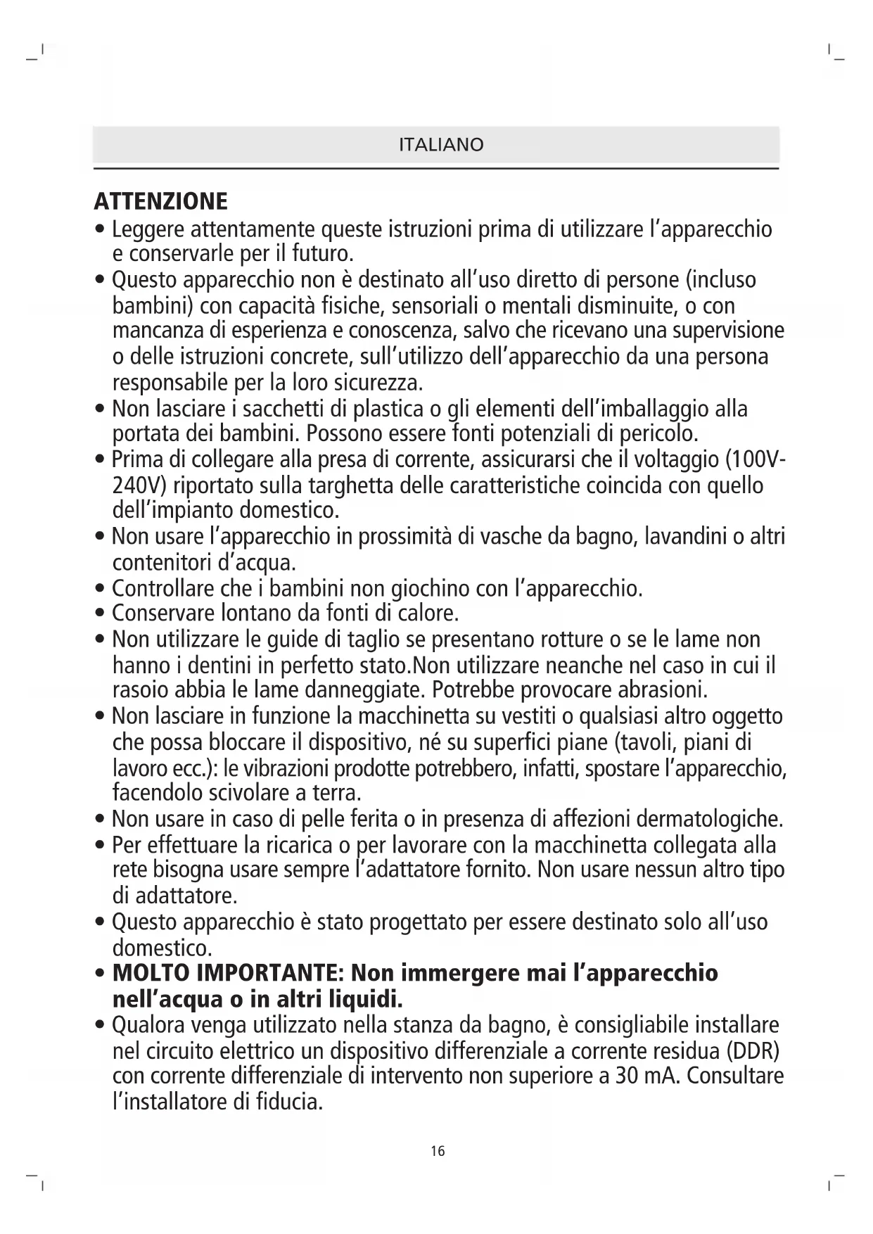 - MOLTO IMPORTANTE: Non immergere mai l’apparecchio nell’acqua o in altri liquidi.