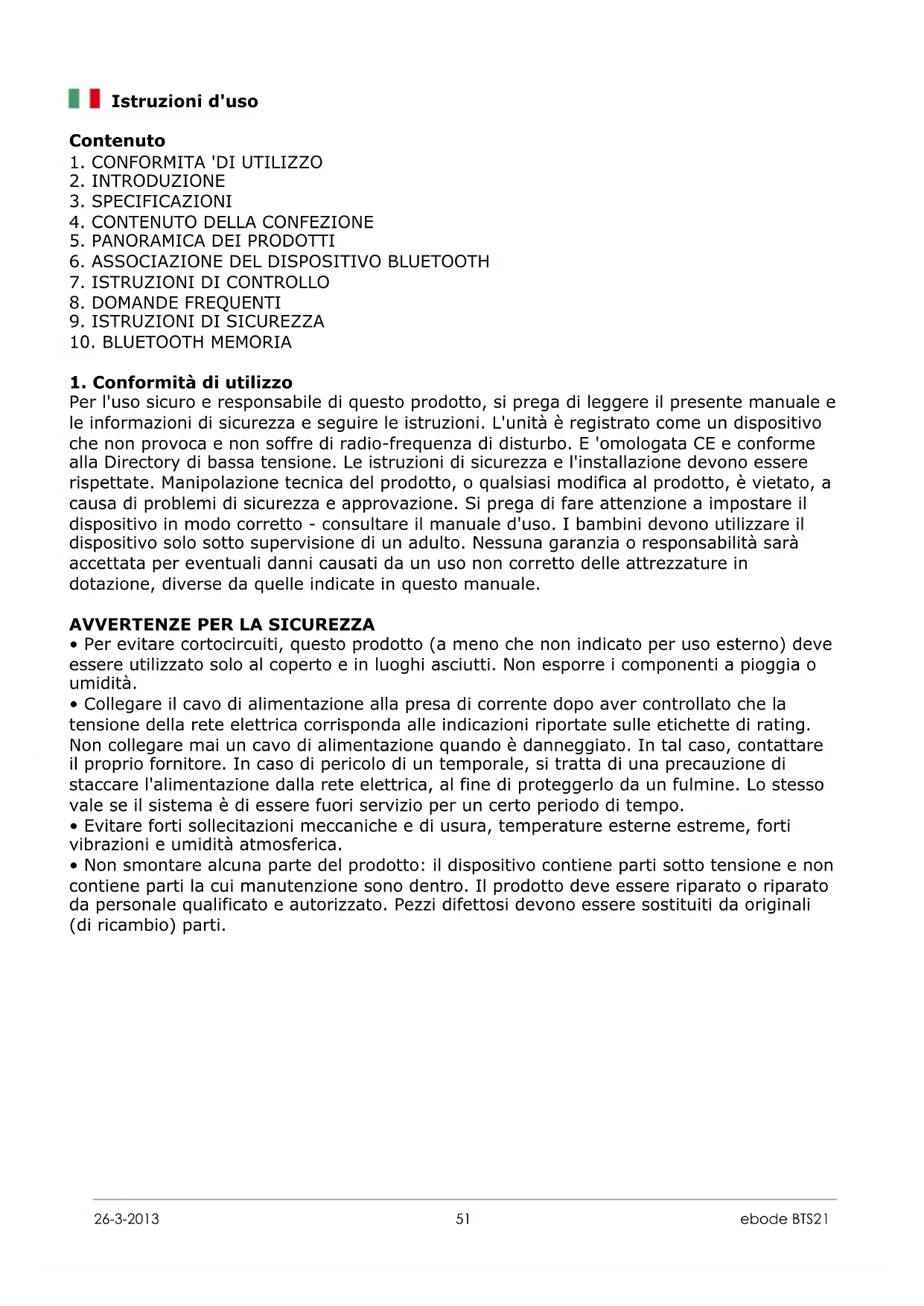 A. Si prega di leggere quanto segue prima di utilizzare il prodotto: Per essere completamente scollegato dalla presa di alimentazione, la spina deve essere scollegata / staccato dalla rete elettrica. Staccare la spina di alimentazione quando il dispositivo dovrebbe essere utilizzato per diversi giorni. B. linee guida aggiuntive per i dispositivi Bluetooth Le onde corte segnali radio frequenza di un dispositivo Bluetooth può compromettere il funzionamento di altri dispositivi elettronici e medici. Spegnere il dispositivo in cui è proibito. Non utilizzare il dispositivo all'interno di strutture sanitarie, gli aerei, i punti di rifornimento, vicino a porte automatiche, allarmi antincendio automatici o altri dispositivi di controllo automatico. Tenere il dispositivo ad almeno 20 cm dal pacemaker e altri dispositivi medici. Le onde radio possono compromettere il funzionamento dei pacemaker e altri dispositivi medici. C. Specifiche tecniche26-3-2013 57 ebode BTS21 Versione Bluetooth: Bluetooth 2.1 + EDR (Enhanced Data Rate) Operazione di frequenza: 2402-2480 MHz Profili Bluetooth supportati: A2DP **, AVRCP ** Codec supportati: SBC Gamma operativa: fino a 10 metri, misurata in spazio aperto *