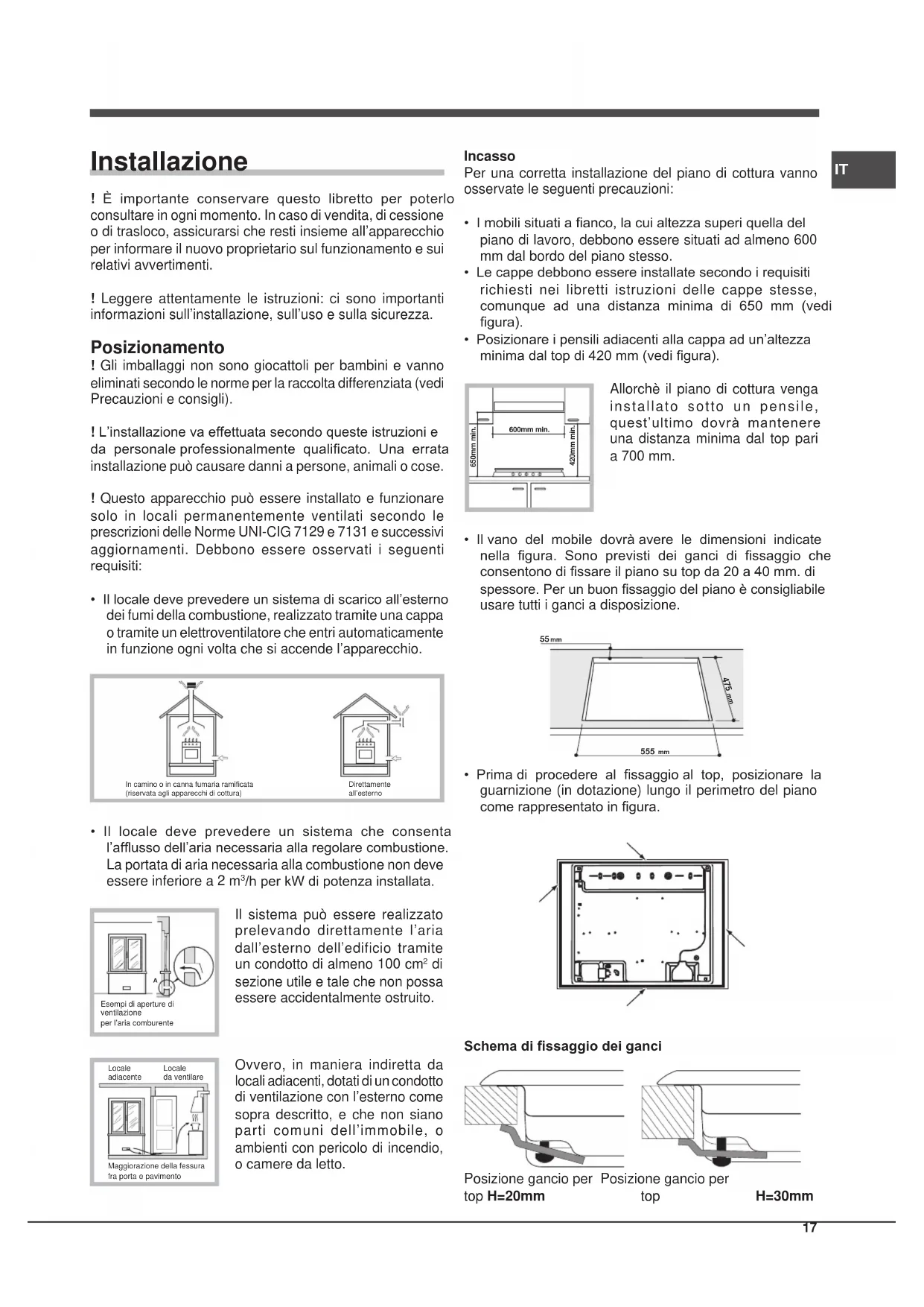 Esempi di aperture di ventilazioneper l’aria comburenteMaggiorazione della fessurafra porta e pavimentoLocaleadiacenteLocaleda ventilare Incasso Per una corretta installazione del piano di cottura vanno osservate le seguenti precauzioni: