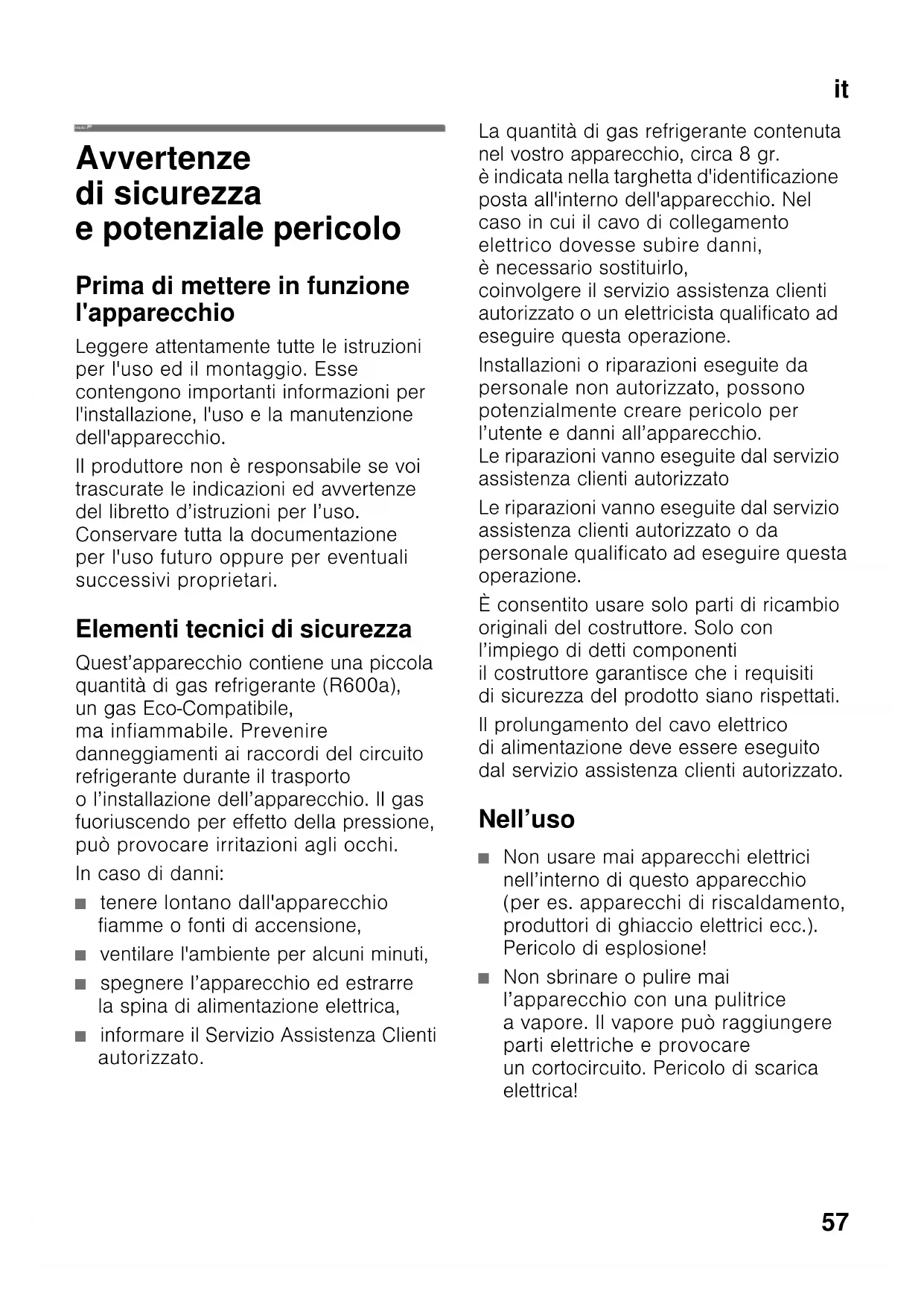 itIndic e itIs truzioni per I´ uso Avvertenze di sicurezza e potenziale pericolo Prima di mettere in funzione l'apparecchio Leggere attentamente tutte le istruzioni per l'uso ed il montaggio. Esse contengono importanti informazioni per l'installazione, l'uso e la manutenzione dell'apparecchio. Il produttore non è responsabile se voi trascurate le indicazioni ed avvertenze del libretto d’istruzioni per l’uso. Conservare tutta la documentazione per l'uso futuro oppure per eventuali successivi proprietari. Elementi tecnici di sicurezza Quest’apparecchio contiene una piccola quantità di gas refrigerante (R600a), un gas Eco-Compatibile, ma infiammabile. Prevenire danneggiamenti ai raccordi del circuito refrigerante durante il trasporto o l’installazione dell’apparecchio. Il gas fuoriuscendo per effetto della pressione, può provocare irritazioni agli occhi. In caso di danni: ■ tenere lontano dall'apparecchio fiamme o fonti di accensione, ■ ventilare l'ambiente per alcuni minuti, ■ spegnere l’apparecchio ed estrarre la spina di alimentazione elettrica, ■ informare il Servizio Assistenza Clienti autorizzato. La quantità di gas refrigerante contenuta nel vostro apparecchio, circa 8 gr. è indicata nella targhetta d'identificazione posta all'interno dell'apparecchio. Nel caso in cui il cavo di collegamento elettrico dovesse subire danni, è necessario sostituirlo, coinvolgere il servizio assistenza clienti autorizzato o un elettricista qualificato ad eseguire questa operazione. Installazioni o riparazioni eseguite da personale non autorizzato, possono potenzialmente creare pericolo per l’utente e danni all’apparecchio. Le riparazioni vanno eseguite dal servizio assistenza clienti autorizzato Le riparazioni vanno eseguite dal servizio assistenza clienti autorizzato o da personale qualificato ad eseguire questa operazione. È consentito usare solo parti di ricambio originali del costruttore. Solo con l’impiego di detti componenti il costruttore garantisce che i requisiti di sicurezza del prodotto siano rispettati. Il prolungamento del cavo elettrico di alimentazione deve essere eseguito dal servizio assistenza clienti autorizzato. Nell’uso ■ Non usare mai apparecchi elettrici nell’interno di questo apparecchio (per es. apparecchi di riscaldamento, produttori di ghiaccio elettrici ecc.). Pericolo di esplosione! ■ Non sbrinare o pulire mai l’apparecchio con una pulitrice a vapore. Il vapore può raggiungere parti elettriche e provocare un cortocircuito. Pericolo di scarica elettrica!it