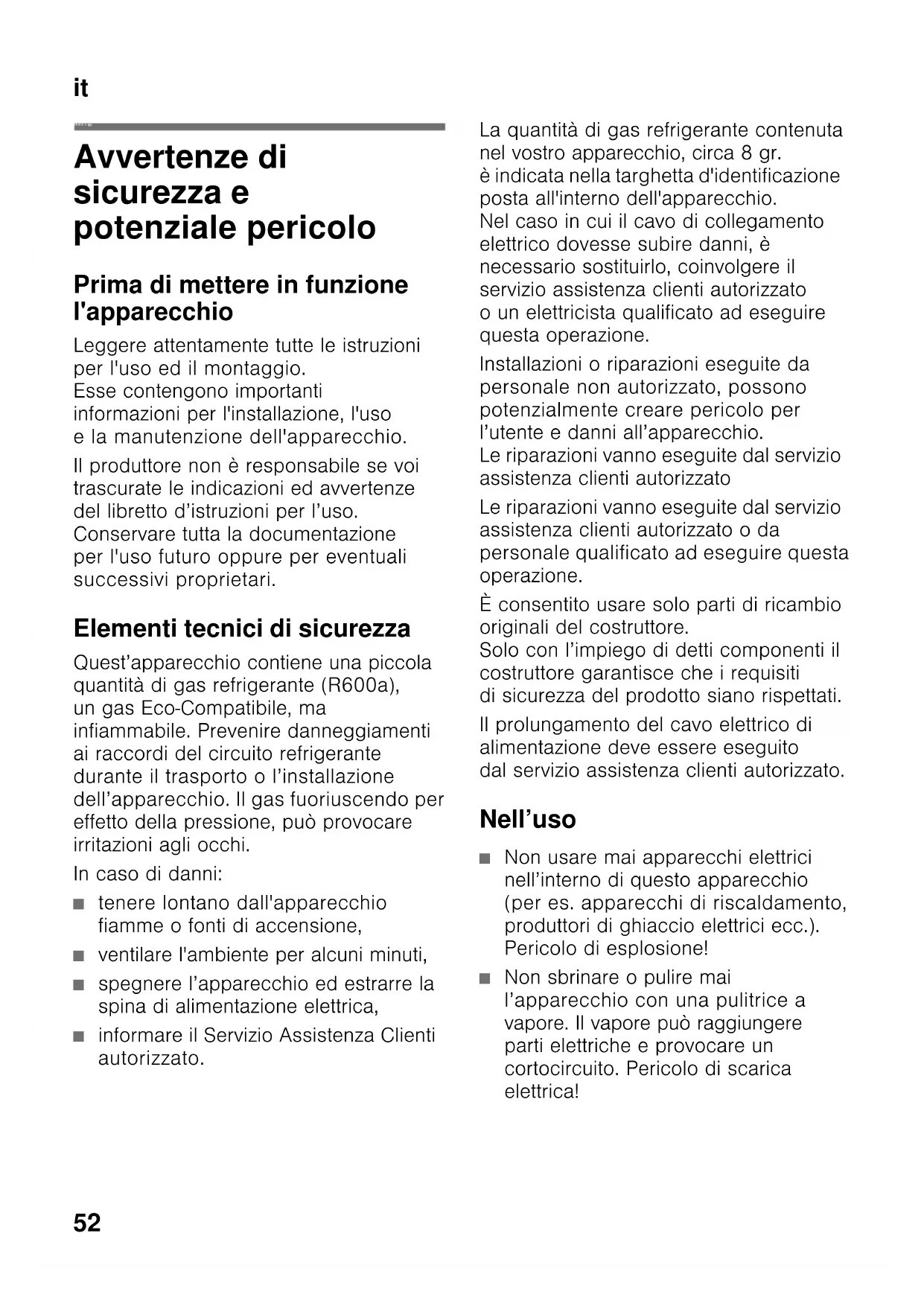 Collegare l’apparecchio Dopo avere posizionato l’apparecchio, attendere circa 1 ore prima di metterlo in funzione, questo assicura che l’olio lubrificante si raccolga nella parte bassa del motore e non penetri nel circuito di raffreddamento. Pulire l’interno dell’apparecchio prima di attivarne la funzione (vedi capitolo «Pulizia dell’apparecchio»). Allacciamento elettrico La presa elettrica deve essere vicino all’apparecchio ed accessibile anche ad installazione avvenuta dell’apparecchio. L’apparecchio è conforme alla classe d’isolamento I. Collegare l’apparecchio a tensione alternata di 220–240 V/50 Hz utilizzando una presa elettrica dotata di connettore di messa a terra. La presa deve essere protetta con dispositivo elettrico di sicurezza da 10–16 A. Per apparecchi, che vengono impiegati in paesi non europei, controllare se la tensione indicata corrisponda ai valori della locale rete elettrica. Questi dati sono riportati nella targhetta porta-dati. Figura 9 ã=Avviso I nostri apparecchi possono essere collegati ad un inverter sinusoidale di rete. Gli inverter di rete vengono utilizzati in abbinamento a impianti fotovoltaici e collegati direttamente alla rete elettrica pubblica. Usare inverter sinusoidali nel caso di soluzioni speciali (es. imbarcazioni oppure nelle baite in montagna), laddove non sia disponibile un collegamento elettrico diretto alla rete pubblica. Conoscere l’apparecchio Svolgere l’ultima pagina con le figure. Questo libretto d’istruzioni per l’uso è valido per vari modelli, pertanto le dotazioni possono variare. Nelle illustrazioni sono possibili differenze.it