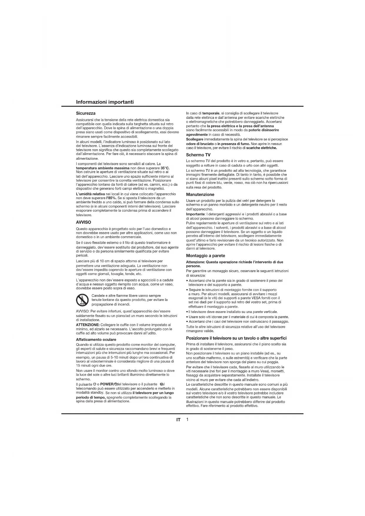 Informazioni importanti Sicurezza Assicurarsi che la tensione della rete elettrica domestica sia compatibile con quella indicata sulla targhetta situata sul retro dell’apparecchio. Dove la spina di alimentazione o una doppia presa siano usati come dispositivo di scollegamento, essi devono rimanere sempre facilmente accessibili. In alcuni modelli, l’indicatore luminoso è posizionato sul lato del televisore. L’assenza d’indicazione luminosa sul fronte del televisore non significa che questo sia completamente scollegato dall’alimentazione. Per fare ciò, è necessario staccare la spina di alimentazione. I componenti del televisore sono sensibili al calore. La temperatura ambiente massima non deve superare 35°C. Non ostruire le aperture di ventilazione situate sul retro o ai lati dell’apparecchio. Lasciare uno spazio sufficiente intorno al televisore per consentire la corretta ventilazione. Posizionare l’apparecchio lontano da fonti di calore (ad es. camini, ecc.) o da dispositivi che generano forti campi elettrici o magnetici. L’umidità relativa nei locali in cui viene collocato l’apparecchio non deve superare l’85%. Se si sposta il televisore da un ambiente freddo a uno caldo, si può formare della condensa sullo schermo (e in alcuni componenti interni del televisore). Lasciare evaporare completamente la condensa prima di accendere il televisore. AVVISO Questo apparecchio è progettato solo per l’uso domestico e non dovrebbe essere usato per altre applicazioni, come uso non domestico o in un ambiente commerciale. Se il cavo flessibile esterno o il filo di questo trasformatore è danneggiato, dev’essere sostituito dal produttore, dal suo agente di servizio o da persona similarmente qualificata per evitare pericoli. Lasciare più di 10 cm di spazio attorno al televisore per permettere una ventilazione adeguata. La ventilazione non dev’essere impedita coprendo le aperture di ventilazione con oggetti come giornali, tovaglie, tende, etc. L’apparecchio non dev’essere esposto a sgocciolii o a cadute d’acqua e nessun oggetto riempito con acqua, come un vaso, dovrebbe essere posto sopra di esso. Candele e altre fiamme libere vanno sempre tenute lontane da questo prodotto, per evitare la propagazione di incendi. AVVISO: Per evitare infortuni, quest’apparecchio dev’essere saldamente fissato su un piano/ad un muro secondo le istruzioni di installazione. ATTENZIONE: Collegare le cuffie con il volume impostato al minimo, ed alzarlo se necessario. L’ascolto prolungato con le cuffie ad alto volume può provocare danni all’udito. Affaticamento oculare Quando si utilizza questo prodotto come monitor del computer, gli esperti di salute e sicurezza raccomandano brevi e frequenti interruzzioni più che interruzioni più lunghe ma occasionali. Per esempio, un pausa di 5-10 minuti dopo un’ora continuativa di lavoro al videoterminale è considerata migliore di una pausa di 15 minuti ogni due ore. Non usare il monitor contro uno sfondo molto luminoso o dove la luce del sole o altre luci brillanti illuminino direttamente lo schermo. Il pulsante o POWER/ del televisore o il pulsante sul telecomando può essere utilizzato per accenderlo e metterlo in modalità standby. Se non si utilizza il televisore per un lungo periodo di tempo, spegnerlo completamente scollegando la spina dalla presa di alimentazione. In caso di temporale, si consiglia di scollegare il televisore dalla rete elettrica e dall’antenna per evitare scariche elettriche o elettromagnetiche che potrebbero danneggiarlo. Accertarsi pertanto che la presa elettrica e la presa dell’antenna siano facilmente accessibili in modo da poterle disinserire agevolmente in caso di necessità. Scollegare immediatamente la spina del televisore se si percepisce odore di bruciato o in presenza di fumo. Non aprire in nessun caso il televisore, per evitare il rischio di scariche elettriche. Schermo TV Lo schermo TV del prodotto è in vetro e, pertanto, può essere soggetto a rotture in caso di caduta o urto con altri oggetti. Lo schermo TV è un prodotto ad alta tecnologia, che garantisce immagini finemente dettagliate. Di tanto in tanto, è possibile che vi siano alcuni pixel inattivi presenti sullo schermo sotto forma di punti fissi di colore blu, verde, rosso, ma ciò non ha ripercussioni sulla resa del prodotto. Manutenzione Usare un prodotto per la pulizia dei vetri per detergere lo schermo e un panno morbido e un detergente neutro per il resto dell’apparecchio. Importante: I detergenti aggressivi e i prodotti abrasivi o a base di alcool possono danneggiare lo schermo. Pulire regolarmente le aperture di ventilazione sul retro e ai lati dell’apparecchio. I solventi, i prodotti abrasivi o a base di alcool possono danneggiare il televisore. Se un oggetto o un liquido penetra all’interno del televisore, scollegare immediatamente quest’ultimo e farlo revisionare da un tecnico autorizzato. Non aprire l’apparecchio per evitare il rischio di lesioni fisiche o di danni al televisore. Montaggio a parete Attenzione: Questa operazione richiede l’intervento di due persone. Per garantire un monaggio sicuro, osservare le seguenti istruzioni di sicurezza: t"DDFSUBSTJDIFMBQBSFUFTJBJOHSBEPEJTPTUFOFSFJMQFTPEFM televisore e del supporto a parete. t4FHVJSFMFJTUSV[JPOJEJNPOUBHHJPGPSOJUFDPOJMTVQQPSUP a muro. Per alcuni modelli, assicurarsi di avvitare i mozzi esagonali (e le viti) dei supporti a parete VESA forniti con il set nei dadi per il supporto sul retro del vostro set, prima di effettuare il montaggio a parete.