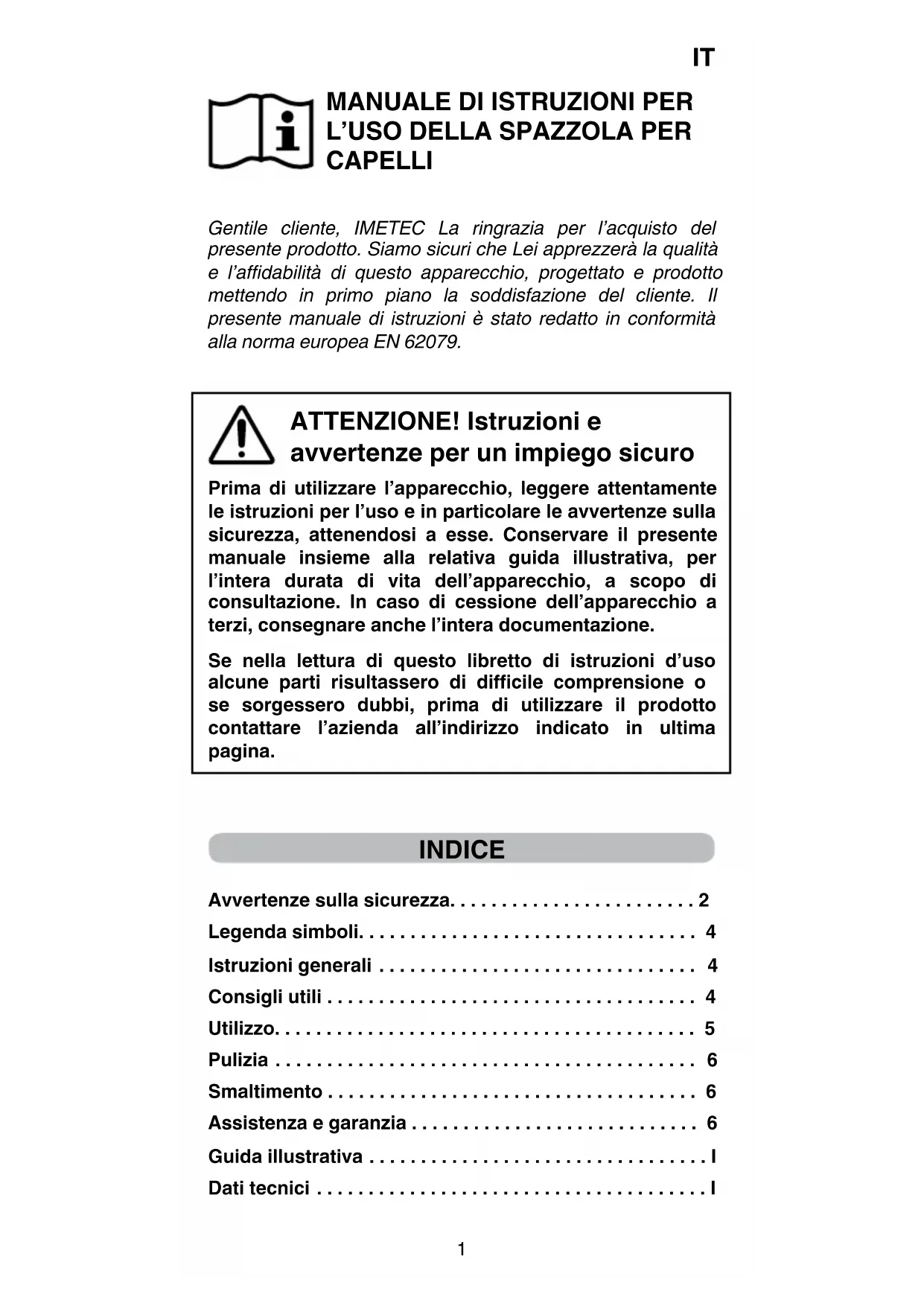 MANUALE DI ISTRUZIONI PER L’USO DELLA SPAZZOLA PER CAPELLI Gentile cliente, IMETEC La ringrazia per l’acquisto del
