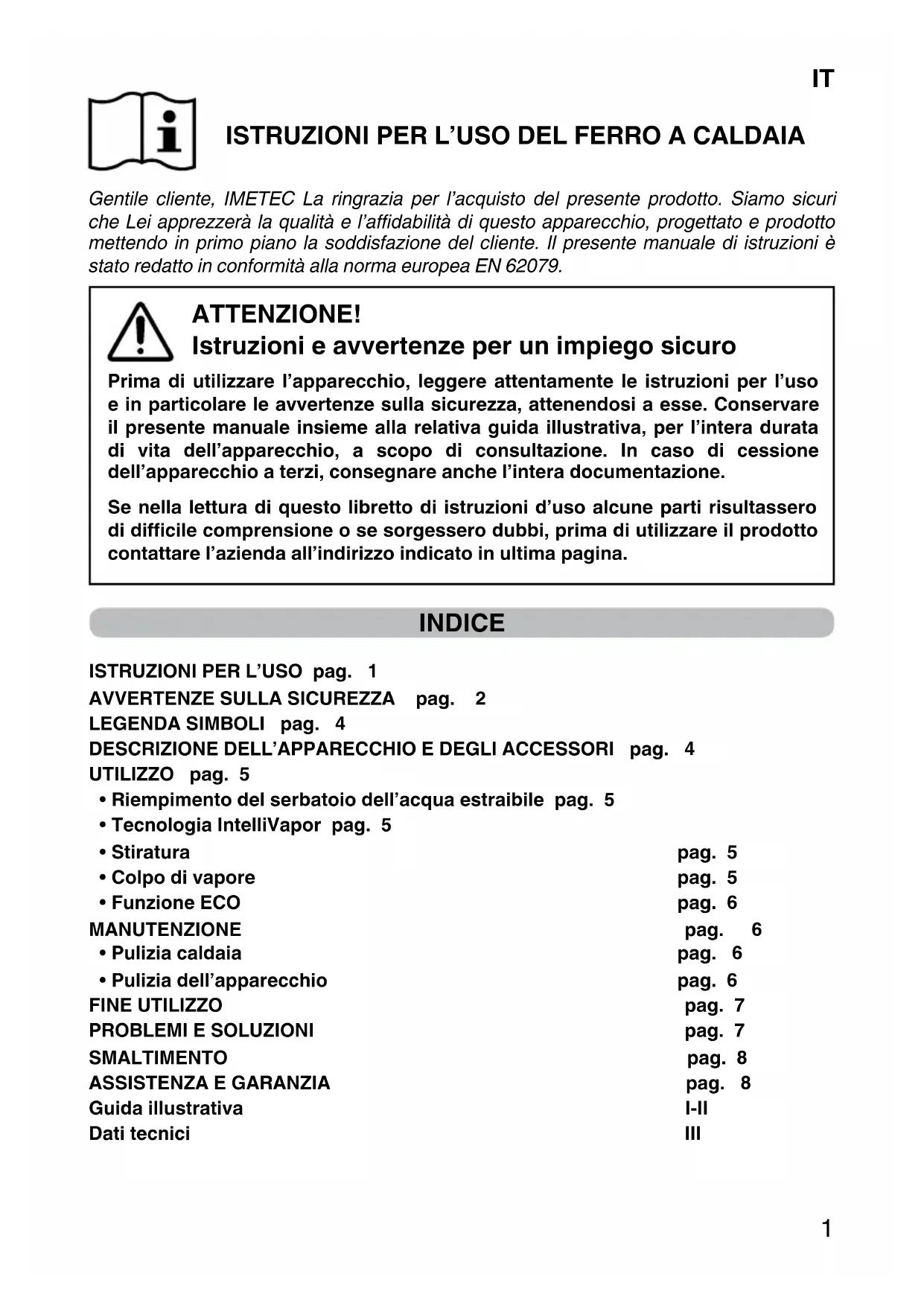 ISTRUZIONI PER L’USO DEL FERRO A CALDAIA Gentile cliente, IMETEC La ringrazia per l’acquisto del presente prodotto. Siamo sicuri che Lei apprezzerà la qualità e l’affidabilità di questo apparecchio, progettato e prodotto mettendo in primo piano la soddisfazione del cliente. Il presente manuale di istruzioni è stato redatto in conformità alla norma europea EN 62079. ATTENZIONE! Istruzioni e avvertenze per un impiego sicuro Prima di utilizzare l’apparecchio, leggere attentamente le istruzioni per l’uso e in particolare le avvertenze sulla sicurezza, attenendosi a esse. Conservare il presente manuale insieme alla relativa guida illustrativa, per l’intera durata di vita dell’apparecchio, a scopo di consultazione. In caso di cessione dell’apparecchio a terzi, consegnare anche l’intera documentazione. Se nella lettura di questo libretto di istruzioni d’uso alcune parti risultassero di difficile comprensione o se sorgessero dubbi, prima di utilizzare il prodotto contattare l’azienda all’indirizzo indicato in ultima pagina. INDICE ISTRUZIONI PER L’USO pag. 1 AVVERTENZE SULLA SICUREZZA pag. 2 LEGENDA SIMBOLI pag. 4 DESCRIZIONE DELL’APPARECCHIO E DEGLI ACCESSORI pag. 4 UTILIZZO pag. 5