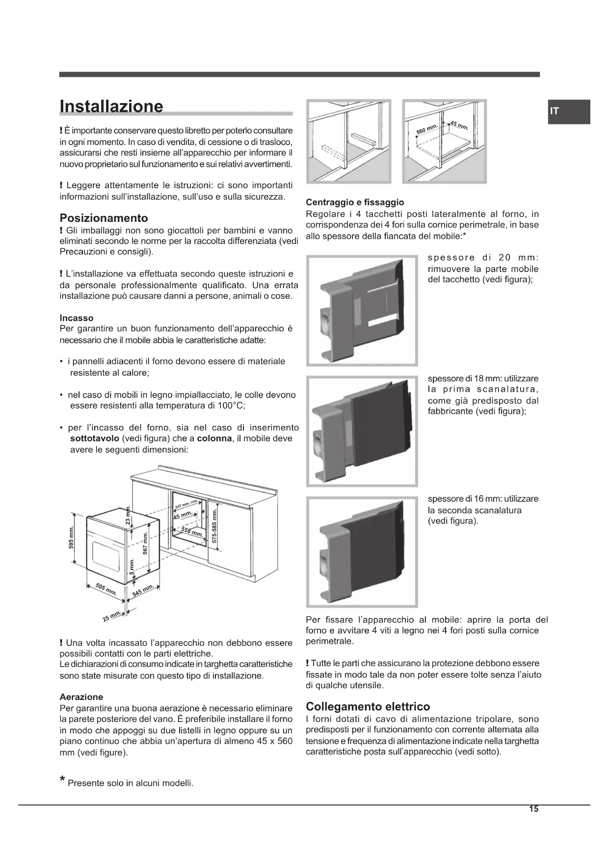 - per l’incasso del forno, sia nel caso di inserimento sottotavolo (vedi gura) che a colonna, il mobile deve avere le seguenti dimensioni: 595 mm. 595 mm.25 mm.545 mm.5 mm.567 mm.23 mm.575-585 mm.45 mm.558 mm. 547 mm. min. ! Una volta incassato l’apparecchio non debbono essere possibili contatti con le parti elettriche. Le dichiarazioni di consumo indicate in targhetta caratteristiche sono state misurate con questo tipo di installazione. Aerazione Per garantire una buona aerazione è necessario eliminare la parete posteriore del vano. È preferibile installare il forno in modo che appoggi su due listelli in legno oppure su un piano continuo che abbia un’apertura di almeno 45 x 560 mm (vedi gure). 560 mm. 45 mm. Centraggio e ssaggio Regolare i 4 tacchetti posti lateralmente al forno, in corrispondenza dei 4 fori sulla cornice perimetrale, in base allo spessore della ancata del mobile:* spessore di 20 mm: rimuovere la parte mobile del tacchetto (vedi gura); spessore di 18 mm: utilizzare la prima scanalatura, come già predisposto dal fabbricante (vedi gura); spessore di 16 mm: utilizzare la seconda scanalatura (vedi gura). Per ssare l’apparecchio al mobile: aprire la porta del forno e avvitare 4 viti a legno nei 4 fori posti sulla cornice perimetrale. ! Tutte le parti che assicurano la protezione debbono essere ssate in modo tale da non poter essere tolte senza l’aiuto di qualche utensile. Collegamento elettrico I forni dotati di cavo di alimentazione tripolare, sono predisposti per il funzionamento con corrente alternata alla tensione e frequenza di alimentazione indicate nella targhetta caratteristiche posta sull’apparecchio (vedi sotto).