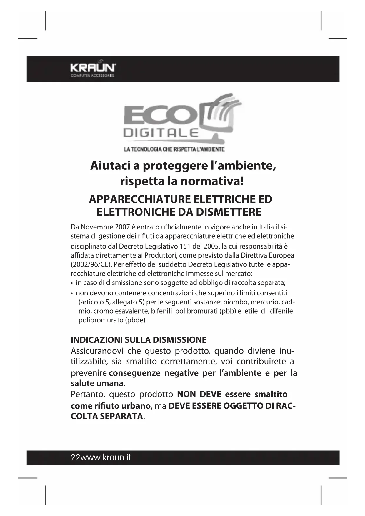 Assicurandovi che questo prodotto, quando diviene inu- tilizzabile, sia smaltito correttamente, voi contribuirete a prevenire conseguenze negative per l’ambiente e per la salute umana. Pertanto, questo prodotto NON DEVE essere smaltito come riuto urbano, ma DEVE ESSERE OGGETTO DI RAC- COLTA SEPARATA.23www.kraun.it Tutti i prodotti oggetto di RACCOLTA SEPARATA sono identicati con il seguente simbolo: Se questo prodotto non è più utilizzato e se desiderate liberar- vene, potete: