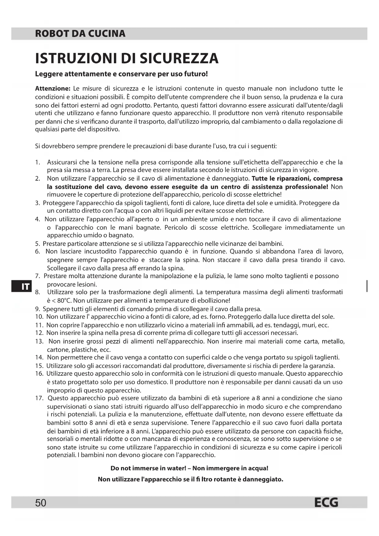 supervisionati osiano stati istruiti riguardo all’uso dell’apparecchio in modo sicuro eche comprendano irischi potenziali. La pulizia ela manutenzione, e ettuate dall’utente, non devono essere e ettuate da bambini sotto 8 anni di età esenza supervisione. Tenere l’apparecchio eil suo cavo fuori dalla portata dei bambini di età inferiore a8 anni. L’apparecchio può essere utilizzato da persone con capacità siche, sensoriali omentali ridotte ocon mancanza di esperienza econoscenza, se sono sotto supervisione ose sono state istruite su come utilizzare l’apparecchio in condizioni di sicurezza esu come capire ipericoli potenziali. Ibambini non devono giocare con l’apparecchio. Do not immerse in water! – Non immergere in acqua! Non utilizzare l'apparecchio se il ltro rotante è danneggiato.51