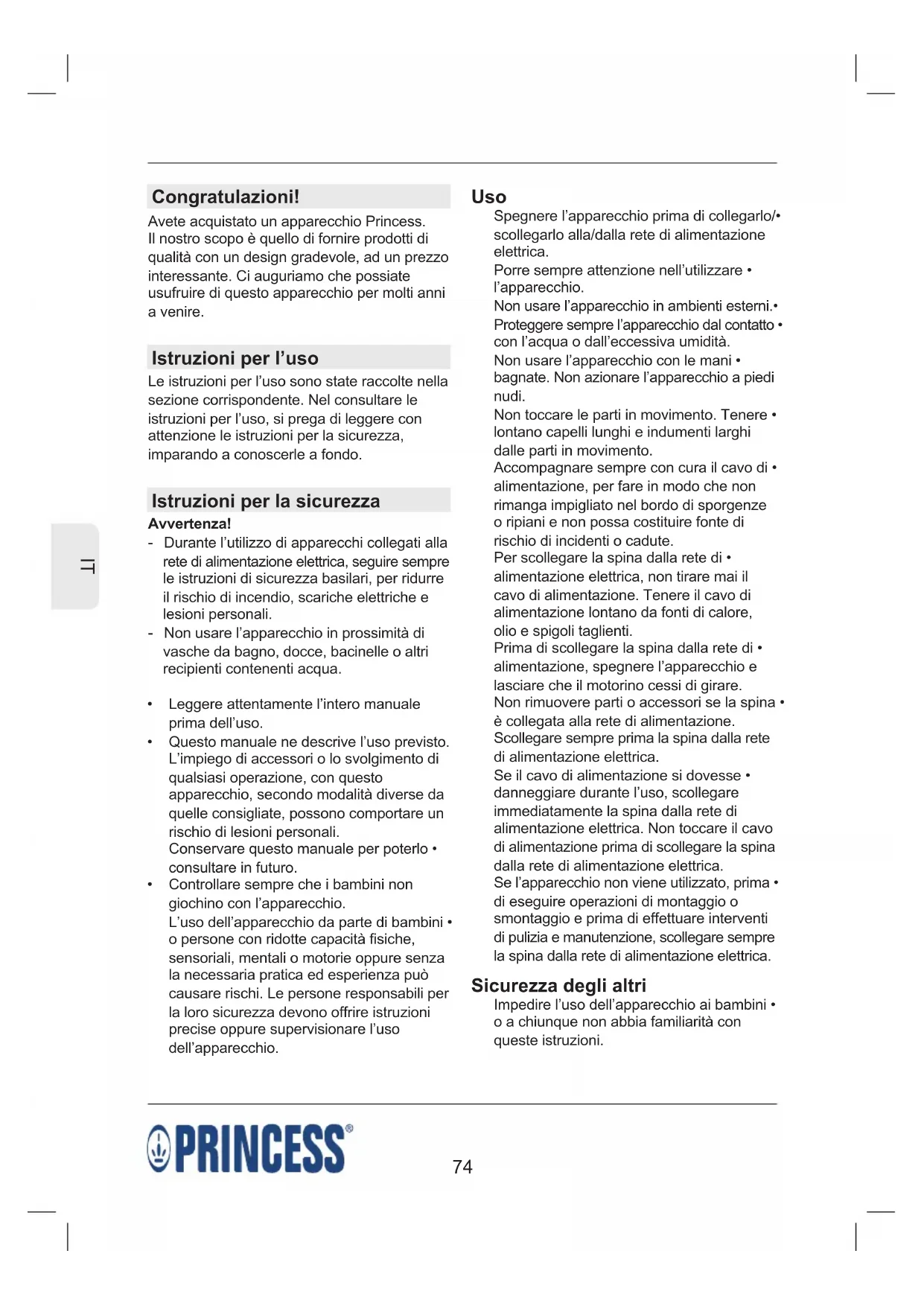Uso Spegnere l’apparecchio prima di collegarlo/ scollegarlo alla/dalla rete di alimentazione elettrica. Porre sempre attenzione nell’utilizzare l’apparecchio. Non usare l’apparecchio in ambienti esterni. Proteggere sempre l’apparecchio dal contatto con l’acqua o dall’eccessiva umidità. Non usare l’apparecchio con le mani bagnate. Non azionare l’apparecchio a piedi nudi. Non toccare le parti in movimento. Tenere lontano capelli lunghi e indumenti larghi dalle parti in movimento. Accompagnare sempre con cura il cavo di alimentazione, per fare in modo che non rimanga impigliato nel bordo di sporgenze o ripiani e non possa costituire fonte di rischio di incidenti o cadute. Per scollegare la spina dalla rete di alimentazione elettrica, non tirare mai il cavo di alimentazione. Tenere il cavo di alimentazione lontano da fonti di calore, olio e spigoli taglienti. Prima di scollegare la spina dalla rete di alimentazione, spegnere l’apparecchio e lasciare che il motorino cessi di girare. Non rimuovere parti o accessori se la spina è collegata alla rete di alimentazione. Scollegare sempre prima la spina dalla rete di alimentazione elettrica. Se il cavo di alimentazione si dovesse danneggiare durante l’uso, scollegare immediatamente la spina dalla rete di alimentazione elettrica. Non toccare il cavo di alimentazione prima di scollegare la spina dalla rete di alimentazione elettrica. Se l’apparecchio non viene utilizzato, prima di eseguire operazioni di montaggio o smontaggio e prima di effettuare interventi di pulizia e manutenzione, scollegare sempre la spina dalla rete di alimentazione elettrica. Sicurezza degli altri Impedire l’uso dell’apparecchio ai bambini o a chiunque non abbia familiarità con queste istruzioni. Congratulazioni! Avete acquistato un apparecchio Princess. Il nostro scopo è quello di fornire prodotti di qualità con un design gradevole, ad un prezzo interessante. Ci auguriamo che possiate usufruire di questo apparecchio per molti anni a venire. Istruzioni per l’uso Le istruzioni per l’uso sono state raccolte nella sezione corrispondente. Nel consultare le istruzioni per l’uso, si prega di leggere con attenzione le istruzioni per la sicurezza, imparando a conoscerle a fondo. Istruzioni per la sicurezza Avvertenza! - Durante l’utilizzo di apparecchi collegati alla rete di alimentazione elettrica, seguire sempre le istruzioni di sicurezza basilari, per ridurre il rischio di incendio, scariche elettriche e lesioni personali. - Non usare l’apparecchio in prossimità di vasche da bagno, docce, bacinelle o altri recipienti contenenti acqua. Leggere attentamente l’intero manuale prima dell’uso. Questo manuale ne descrive l’uso previsto. L’impiego di accessori o lo svolgimento di qualsiasi operazione, con questo apparecchio, secondo modalità diverse da quelle consigliate, possono comportare un rischio di lesioni personali. Conservare questo manuale per poterlo consultare in futuro. Controllare sempre che i bambini non giochino con l’apparecchio. L’uso dell’apparecchio da parte di bambini o persone con ridotte capacità fisiche, sensoriali, mentali o motorie oppure senza la necessaria pratica ed esperienza può causare rischi. Le persone responsabili per la loro sicurezza devono offrire istruzioni precise oppure supervisionare l’uso dell’apparecchio.