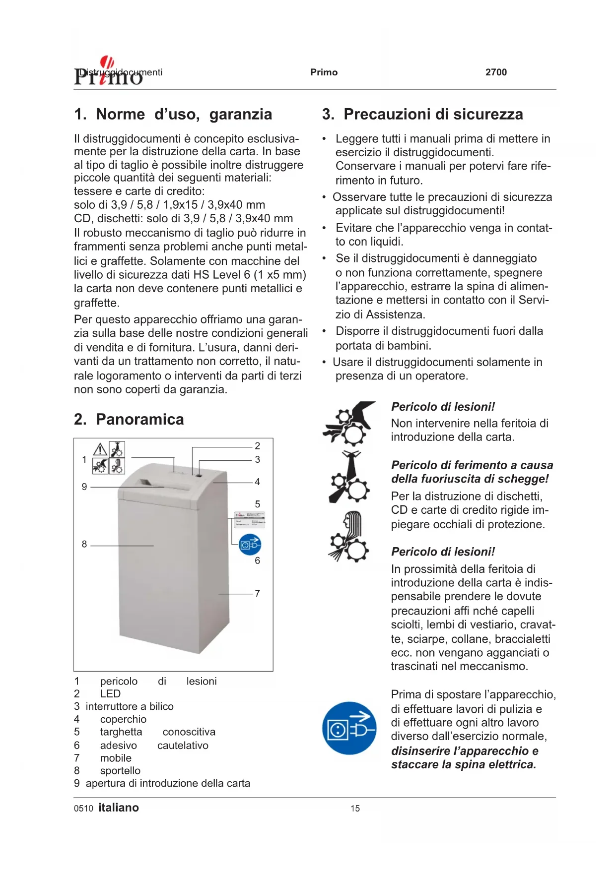 - tecnici autorizzati delle consociate. Prima della massa in funzione: Svitare ed estrarre le viti ad alette del fermo di trasporto 2Distruggidocumenti Primo 2700 0510 italiano 17 Contatto sportello interrotto