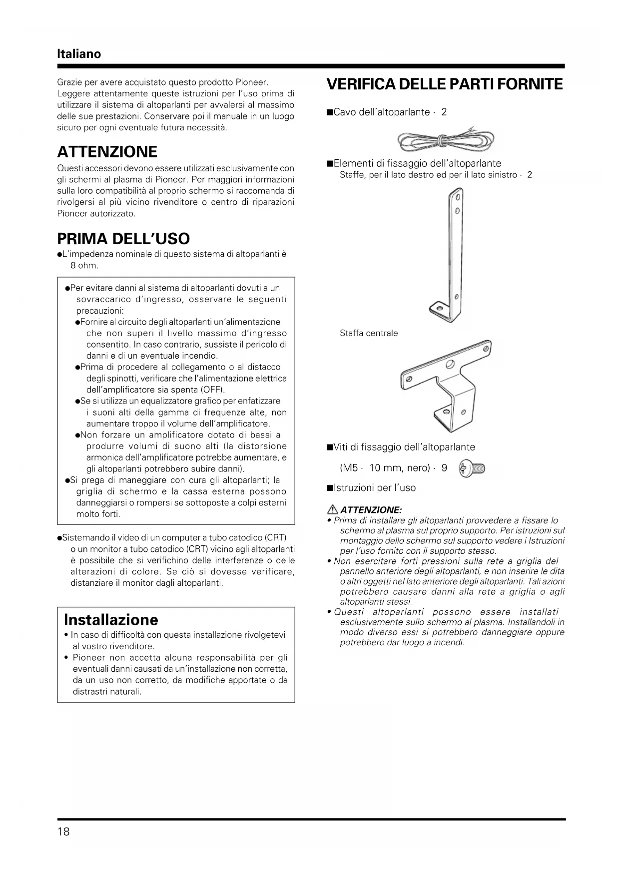 18 Grazie per avere acquistato questo prodotto Pioneer.Leggere attentamente queste istruzioni per l’uso prima diutilizzare il sistema di altoparlanti per avvalersi al massimodelle sue prestazioni. Conservare poi il manuale in un luogosicuro per ogni eventuale futura necessità. ATTENZIONE Questi accessori devono essere utilizzati esclusivamente congli schermi al plasma di Pioneer. Per maggiori informazionisulla loro compatibilità al proprio schermo si raccomanda dirivolgersi al più vicino rivenditore o centro di riparazioniPioneer autorizzato. PRIMA DELL’USO ÷ L’impedenza nominale di questo sistema di altoparlanti è8 ohm.÷ Per evitare danni al sistema di altoparlanti dovuti a unsovraccarico d’ingresso, osservare le seguentiprecauzioni:÷ Fornire al circuito degli altoparlanti un’alimentazioneche non superi il livello massimo d’ingressoconsentito. In caso contrario, sussiste il pericolo didanni e di un eventuale incendio.÷ Prima di procedere al collegamento o al distaccodegli spinotti, verificare che l’alimentazione elettricadell’amplificatore sia spenta (OFF).÷ Se si utilizza un equalizzatore grafico per enfatizzarei suoni alti della gamma di frequenze alte, nonaumentare troppo il volume dell’amplificatore.÷ Non forzare un amplificatore dotato di bassi aprodurre volumi di suono alti (la distorsionearmonica dell’amplificatore potrebbe aumentare, egli altoparlanti potrebbero subire danni).÷ Si prega di maneggiare con cura gli altoparlanti; lagriglia di schermo e la cassa esterna possonodanneggiarsi o rompersi se sottoposte a colpi esternimolto forti.÷ Sistemando il video di un computer a tubo catodico (CRT)o un monitor a tubo catodico (CRT) vicino agli altoparlantiè possibile che si verifichino delle interferenze o dellealterazioni di colore. Se ciò si dovesse verificare,distanziare il monitor dagli altoparlanti. Installazione • In caso di difficoltà con questa installazione rivolgetevial vostro rivenditore.• Pioneer non accetta alcuna responsabilità per glieventuali danni causati da un’installazione non corretta,da un uso non corretto, da modifiche apportate o dadistrastri naturali. VERIFICA DELLE PARTI FORNITE