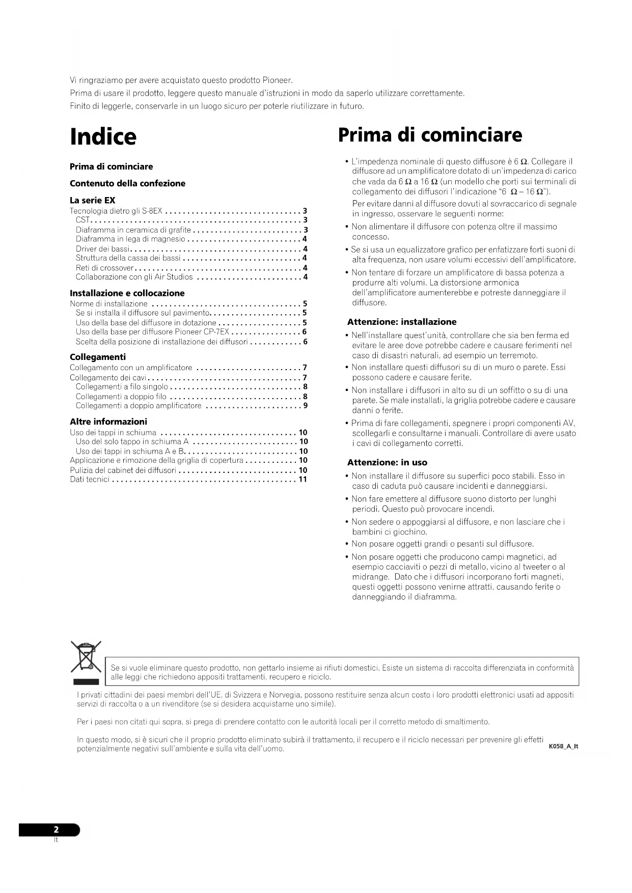 confezione Punte x 3Cuscinetti in sughero x 3Cuscinetti antiscivolamento grandi x 2Cuscinetti antiscivolamento piccoli x 4Tappi in schiuma (A,B) x 2Base del diffusore x 1Rondelle x 2Rondella elastica x 1Vite (M5 x L40) x 1Viti (M6 x L35) x 6Griglia x 1Istruzioni per l’uso La serie EX La serie EX, che include il grande know-how della serie di diffusori Pioneer TAD, è stata sviluppata per creare i diffusori migliori possibili in questa gamma di prezzo. Il design e la produzione della serie EX sono il risultato di uno sforzo di livello internazionale che rappresenta quanto c’è di meglio nella tecnologia per diffusori di Pioneer.