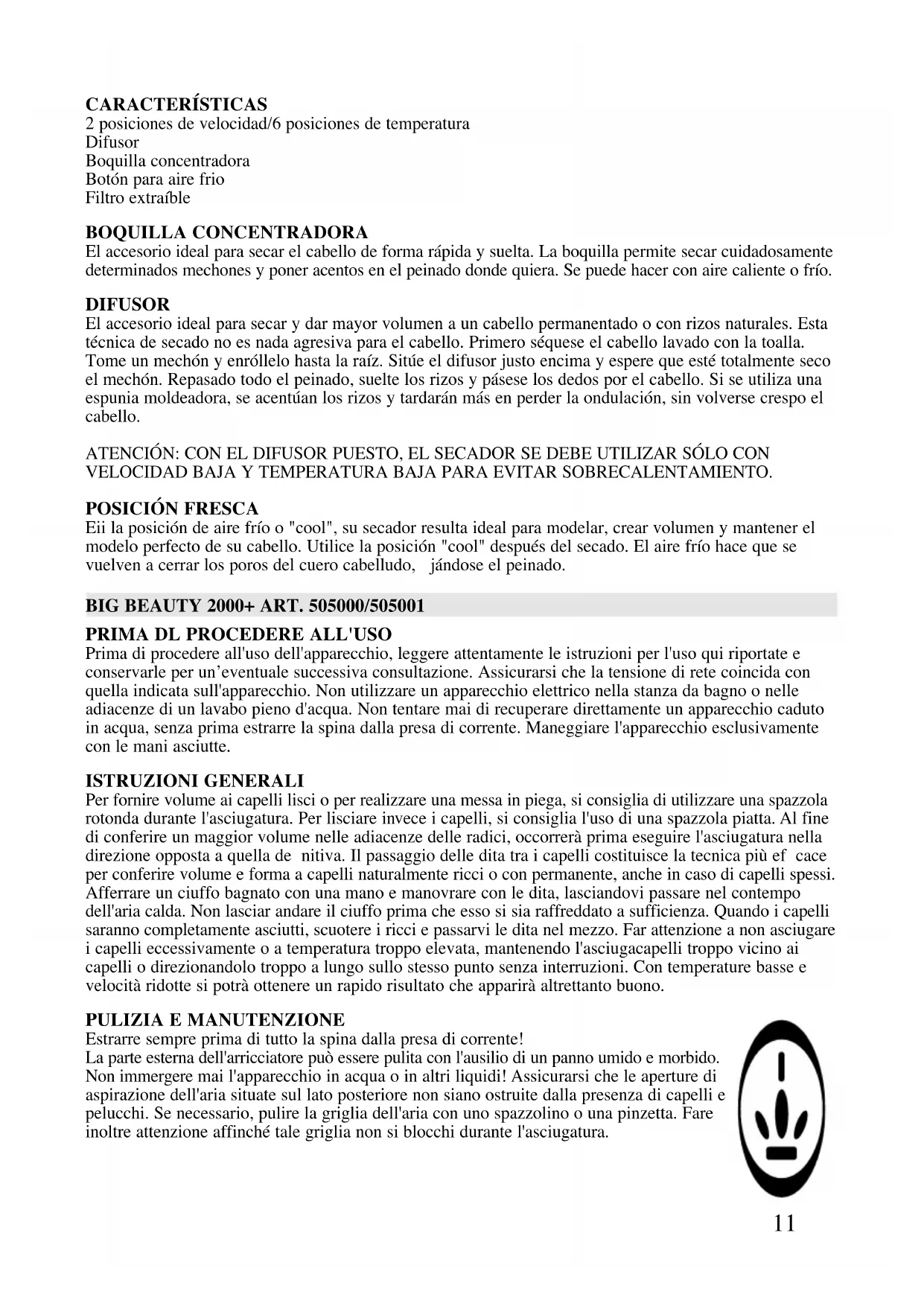 Prima di procedere all'uso dell'apparecchio, leggere attentamente le istruzioni per l'uso qui riportate e conservarle per un’eventuale successiva consultazione. Assicurarsi che la tensione di rete coincida con quella indicata sull'apparecchio. Non utilizzare un apparecchio elettrico nella stanza da bagno o nelle adiacenze di un lavabo pieno d'acqua. Non tentare mai di recuperare direttamente un apparecchio caduto in acqua, senza prima estrarre la spina dalla presa di corrente. Maneggiare l'apparecchio esclusivamente con le mani asciutte. ISTRUZIONI GENERALI Per fornire volume ai capelli lisci o per realizzare una messa in piega, si consiglia di utilizzare una spazzola rotonda durante l'asciugatura. Per lisciare invece i capelli, si consiglia l'uso di una spazzola piatta. Al fine di conferire un maggior volume nelle adiacenze delle radici, occorrerà prima eseguire l'asciugatura nella direzione opposta a quella definitiva. Il passaggio delle dita tra i capelli costituisce la tecnica più efficace per conferire volume e forma a capelli naturalmente ricci o con permanente, anche in caso di capelli spessi. Afferrare un ciuffo bagnato con una mano e manovrare con le dita, lasciandovi passare nel contempo dell'aria calda. Non lasciar andare il ciuffo prima che esso si sia raffreddato a sufficienza. Quando i capelli saranno completamente asciutti, scuotere i ricci e passarvi le dita nel mezzo. Far attenzione a non asciugare i capelli eccessivamente o a temperatura troppo elevata, mantenendo l'asciugacapelli troppo vicino ai capelli o direzionandolo troppo a lungo sullo stesso punto senza interruzioni. Con temperature basse e velocità ridotte si potrà ottenere un rapido risultato che apparirà altrettanto buono.
