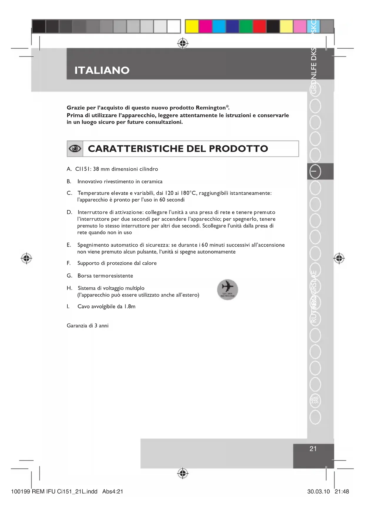 . Prima di utilizzare l’apparecchio, leggere attentamente le istruzioni e conservarle in un luogo sicuro per future consultazioni. CARATTERISTICHE DEL PRODOTTO A. CI151: 38 mm dimensioni cilindroB. Innovativo rivestimento in ceramica C. Temperature elevate e variabili, dai 120 ai 180°C, raggiungibili istantaneamente: l’apparecchio è pronto per l’uso in 60 secondi D. Interruttore di attivazione: collegare l’unità a una presa di rete e tenere premuto l’interruttore per due secondi per accendere l’apparecchio; per spegnerlo, tenere premuto lo stesso interruttore per altri due secondi. Scollegare l’unità dalla presa di rete quando non in uso E. Spegnimento automatico di sicurezza: se durante i 60 minuti successivi all’accensione non viene premuto alcun pulsante, l‘unità si spegne autonomamenteF. Supporto di protezione dal caloreG. Borsa termoresistenteH. Sistema di voltaggio multiplo (l’apparecchio può essere utilizzato anche all’estero)I. Cavo avvolgibile da 1.8m Garanzia di 3 anni 100199 REM IFU Ci151_21L.indd Abs4:21100199 REM IFU Ci151_21L.indd Abs4:21 30.03.10 21:4830.03.10 21:48ITALIANO