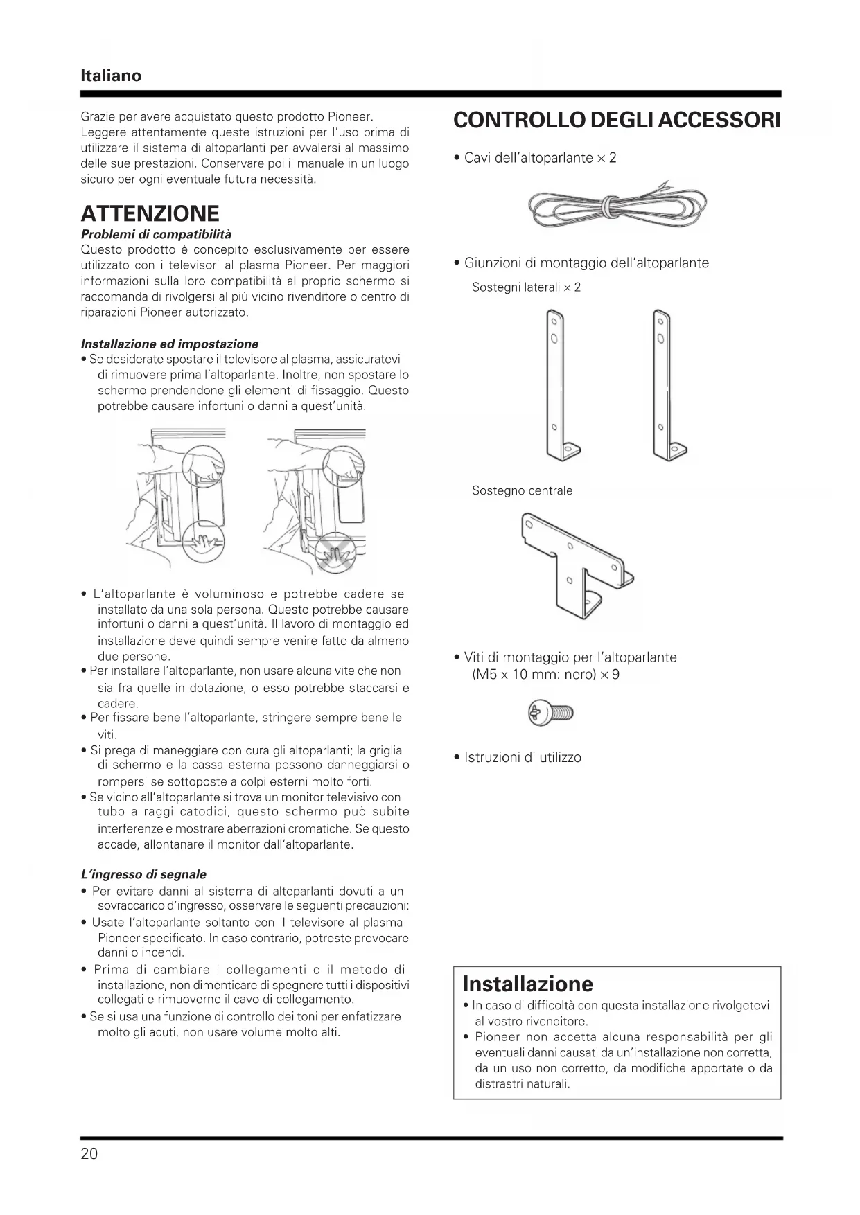 ATTENZIONE Problemi di compatibilità Questo prodotto è concepito esclusivamente per essereutilizzato con i televisori al plasma Pioneer. Per maggioriinformazioni sulla loro compatibilità al proprio schermo siraccomanda di rivolgersi al più vicino rivenditore o centro diriparazioni Pioneer autorizzato. Installazione ed impostazione • Se desiderate spostare il televisore al plasma, assicuratevidi rimuovere prima l’altoparlante. Inoltre, non spostare loschermo prendendone gli elementi di fissaggio. Questopotrebbe causare infortuni o danni a quest’unità.• L’altoparlante è voluminoso e potrebbe cadere seinstallato da una sola persona. Questo potrebbe causareinfortuni o danni a quest’unità. Il lavoro di montaggio edinstallazione deve quindi sempre venire fatto da almenodue persone.• Per installare l’altoparlante, non usare alcuna vite che nonsia fra quelle in dotazione, o esso potrebbe staccarsi ecadere.• Per fissare bene l’altoparlante, stringere sempre bene leviti.• Si prega di maneggiare con cura gli altoparlanti; la grigliadi schermo e la cassa esterna possono danneggiarsi orompersi se sottoposte a colpi esterni molto forti.• Se vicino all’altoparlante si trova un monitor televisivo contubo a raggi catodici, questo schermo può subiteinterferenze e mostrare aberrazioni cromatiche. Se questoaccade, allontanare il monitor dall’altoparlante. L’ingresso di segnale • Per evitare danni al sistema di altoparlanti dovuti a unsovraccarico d’ingresso, osservare le seguenti precauzioni:• Usate l’altoparlante soltanto con il televisore al plasmaPioneer specificato. In caso contrario, potreste provocaredanni o incendi.• Prima di cambiare i collegamenti o il metodo diinstallazione, non dimenticare di spegnere tutti i dispositivicollegati e rimuoverne il cavo di collegamento.• Se si usa una funzione di controllo dei toni per enfatizzaremolto gli acuti, non usare volume molto alti. CONTROLLO DEGLI ACCESSORI