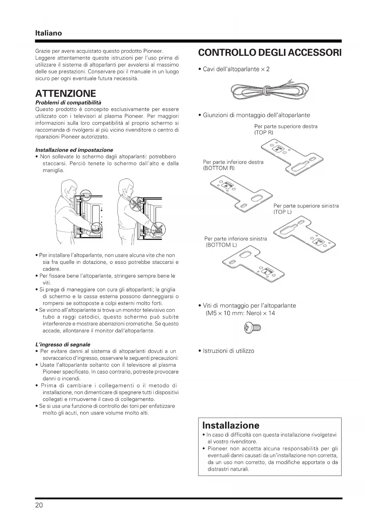 ATTENZIONE Problemi di compatibilità Questo prodotto è concepito esclusivamente per essereutilizzato con i televisori al plasma Pioneer. Per maggioriinformazioni sulla loro compatibilità al proprio schermo siraccomanda di rivolgersi al più vicino rivenditore o centro diriparazioni Pioneer autorizzato. Installazione ed impostazione • Non sollevate lo schermo dagli altoparlanti: potrebberostaccarsi. Perciò tenete lo schermo dall’alto e dallamaniglia. CONTROLLO DEGLI ACCESSORI