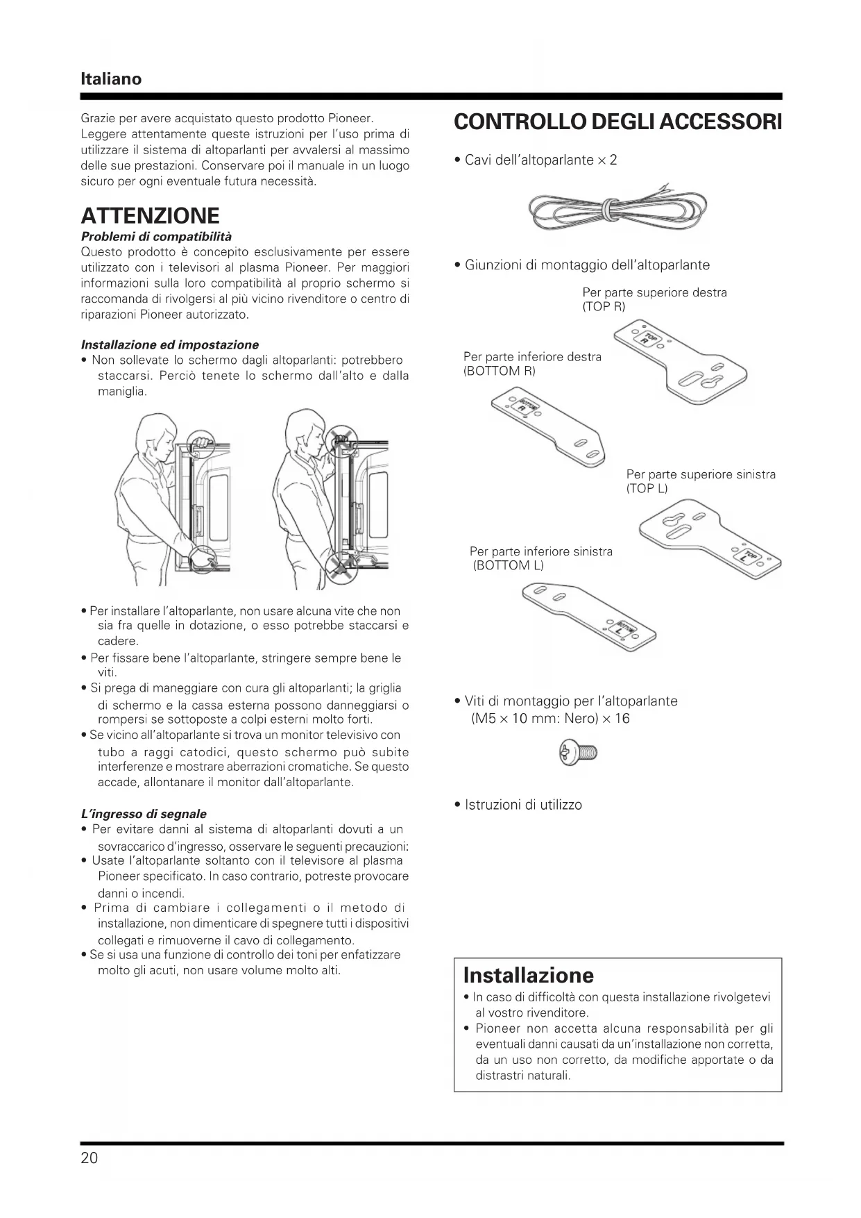 ATTENZIONE Problemi di compatibilità Questo prodotto è concepito esclusivamente per essereutilizzato con i televisori al plasma Pioneer. Per maggioriinformazioni sulla loro compatibilità al proprio schermo siraccomanda di rivolgersi al più vicino rivenditore o centro diriparazioni Pioneer autorizzato. Installazione ed impostazione • Non sollevate lo schermo dagli altoparlanti: potrebberostaccarsi. Perciò tenete lo schermo dall’alto e dallamaniglia. CONTROLLO DEGLI ACCESSORI
