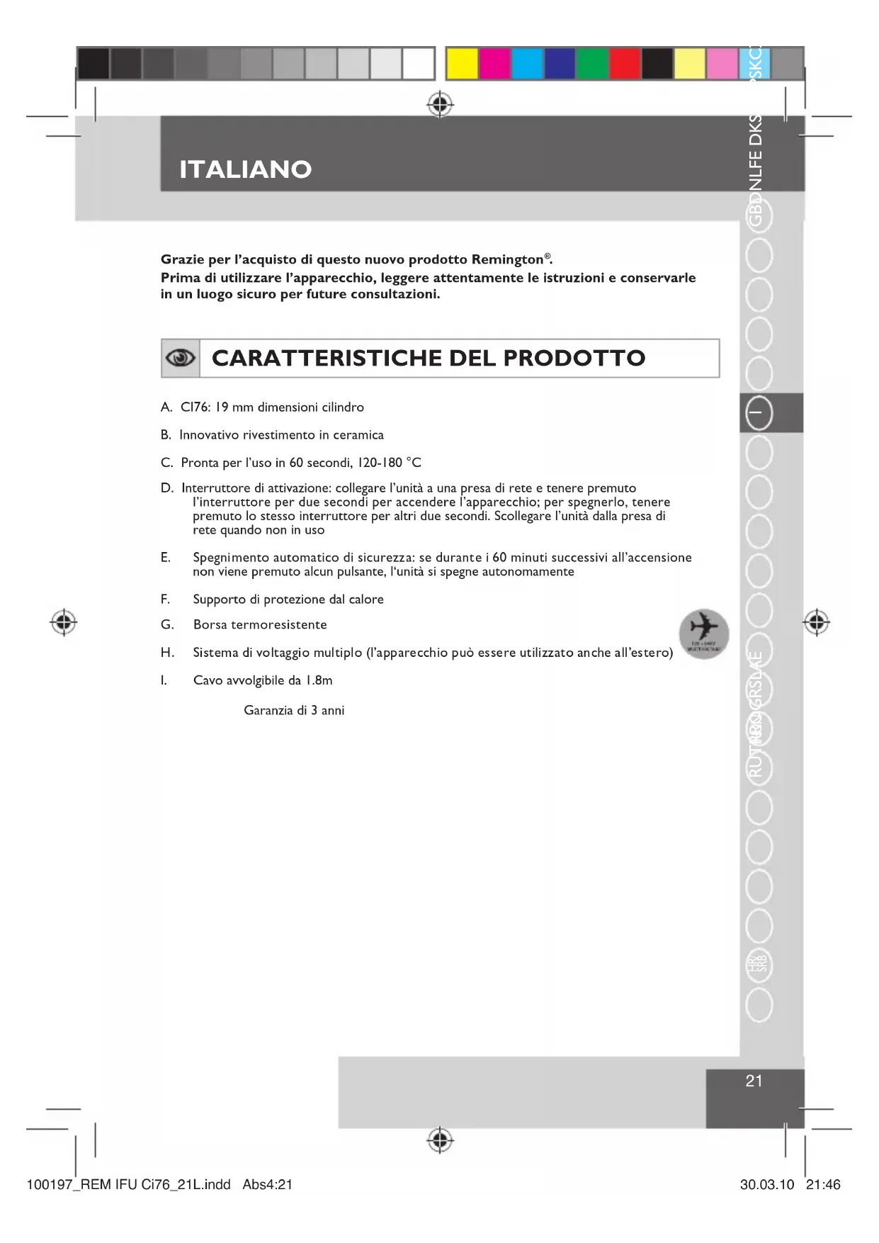 . Prima di utilizzare l’apparecchio, leggere attentamente le istruzioni e conservarle in un luogo sicuro per future consultazioni. CARATTERISTICHE DEL PRODOTTO A. CI76: 19 mm dimensioni cilindroB. Innovativo rivestimento in ceramicaC. Pronta per l’uso in 60 secondi, 120-180 °CD. Interruttore di attivazione: collegare l’unità a una presa di rete e tenere premuto l’interruttore per due secondi per accendere l’apparecchio; per spegnerlo, tenere premuto lo stesso interruttore per altri due secondi. Scollegare l’unità dalla presa di rete quando non in uso E. Spegnimento automatico di sicurezza: se durante i 60 minuti successivi all’accensione non viene premuto alcun pulsante, l‘unità si spegne autonomamenteF. Supporto di protezione dal caloreG. Borsa termoresistente H. Sistema di voltaggio multiplo (l’apparecchio può essere utilizzato anche all’estero) I. Cavo avvolgibile da 1.8m Garanzia di 3 anni 100197_REM IFU Ci76_21L.indd Abs4:21100197_REM IFU Ci76_21L.indd Abs4:21 30.03.10 21:4630.03.10 21:46ITALIANO
