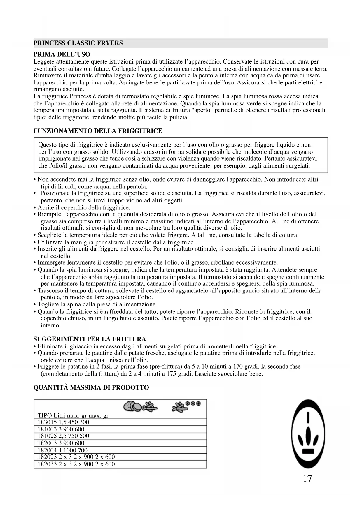 PRINCESS CLASSIC FRYERS PRIMA DELL’USO Leggete attentamente queste istruzioni prima di utilizzate l’apparecchio. Conservate le istruzioni con cura per