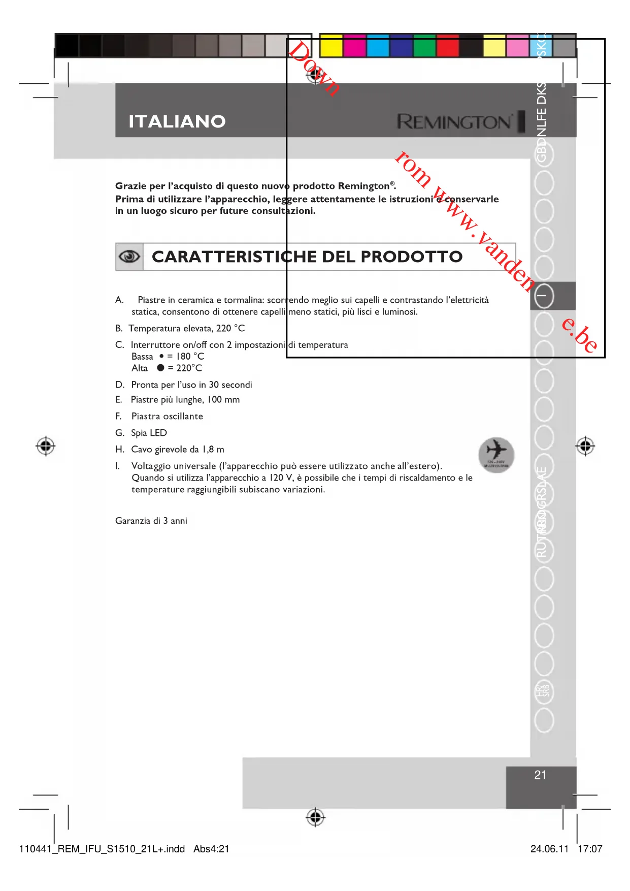 . Prima di utilizzare l’apparecchio, leggere attentamente le istruzioni e conservarle in un luogo sicuro per future consultazioni. CARATTERISTICHE DEL PRODOTTO A. Piastre in ceramica e tormalina: scorrendo meglio sui capelli e contrastando l’elettricità statica, consentono di ottenere capelli meno statici, più lisci e luminosi.B. Temperatura elevata, 220 °CC. Interruttore on/off con 2 impostazioni di temperatura Bassa = 180 °C Alta = 220°CD. Pronta per l’uso in 30 secondiE. Piastre più lunghe, 100 mm F. Piastra oscillante G. Spia LED H. Cavo girevole da 1,8 m I. Voltaggio universale (l’apparecchio può essere utilizzato anche all’estero). Quando si utilizza l’apparecchio a 120 V, è possibile che i tempi di riscaldamento e le temperature raggiungibili subiscano variazioni.Garanzia di 3 anni110441_REM_IFU_S1510_21L+.indd Abs4:21 24.06.11 17:07Downloaded from www.vandenborre.be