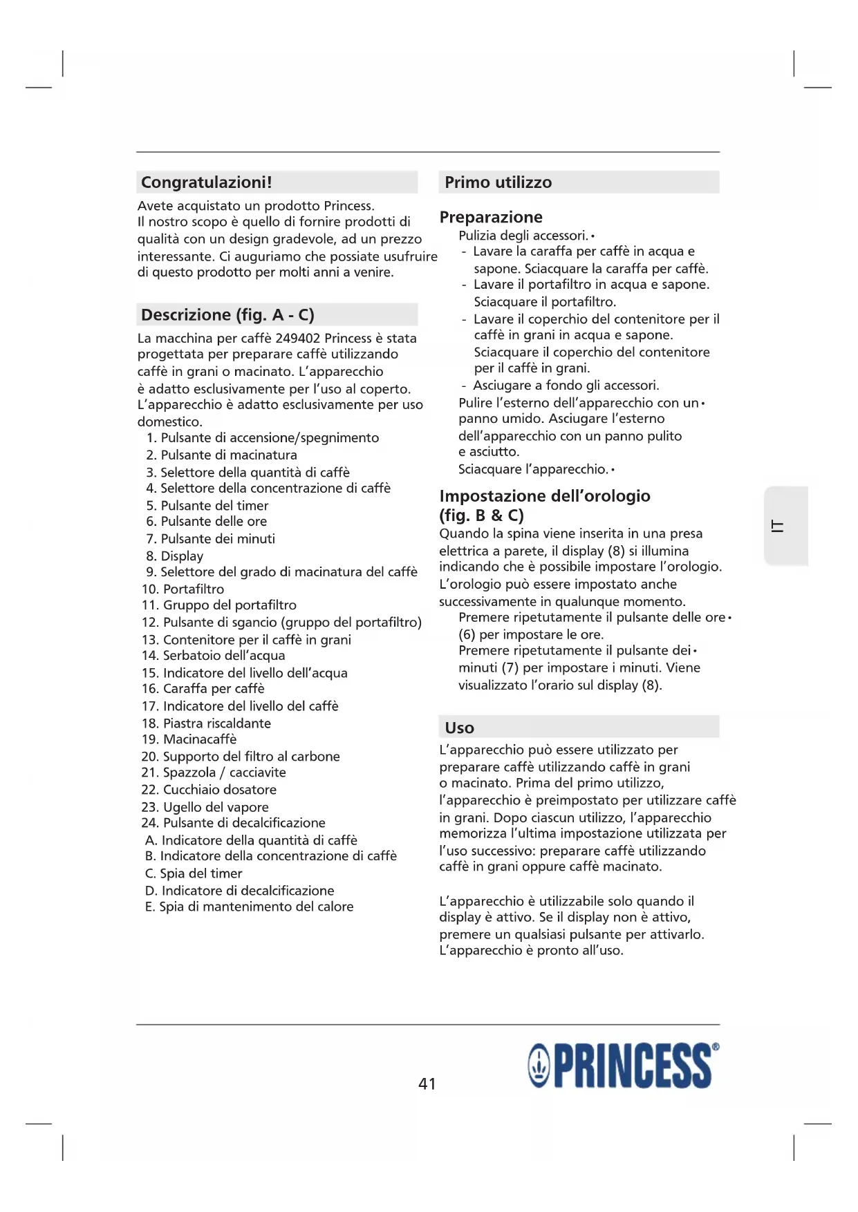 Congratulazioni! Avete acquistato un prodotto Princess. Il nostro scopo è quello di fornire prodotti di qualità con un design gradevole, ad un prezzo interessante. Ci auguriamo che possiate usufruire di questo prodotto per molti anni a venire. Descrizione (fig. A - C) La macchina per caffè 249402 Princess è stata progettata per preparare caffè utilizzando caffè in grani o macinato. L’apparecchio è adatto esclusivamente per l’uso al coperto. L’apparecchio è adatto esclusivamente per uso domestico.