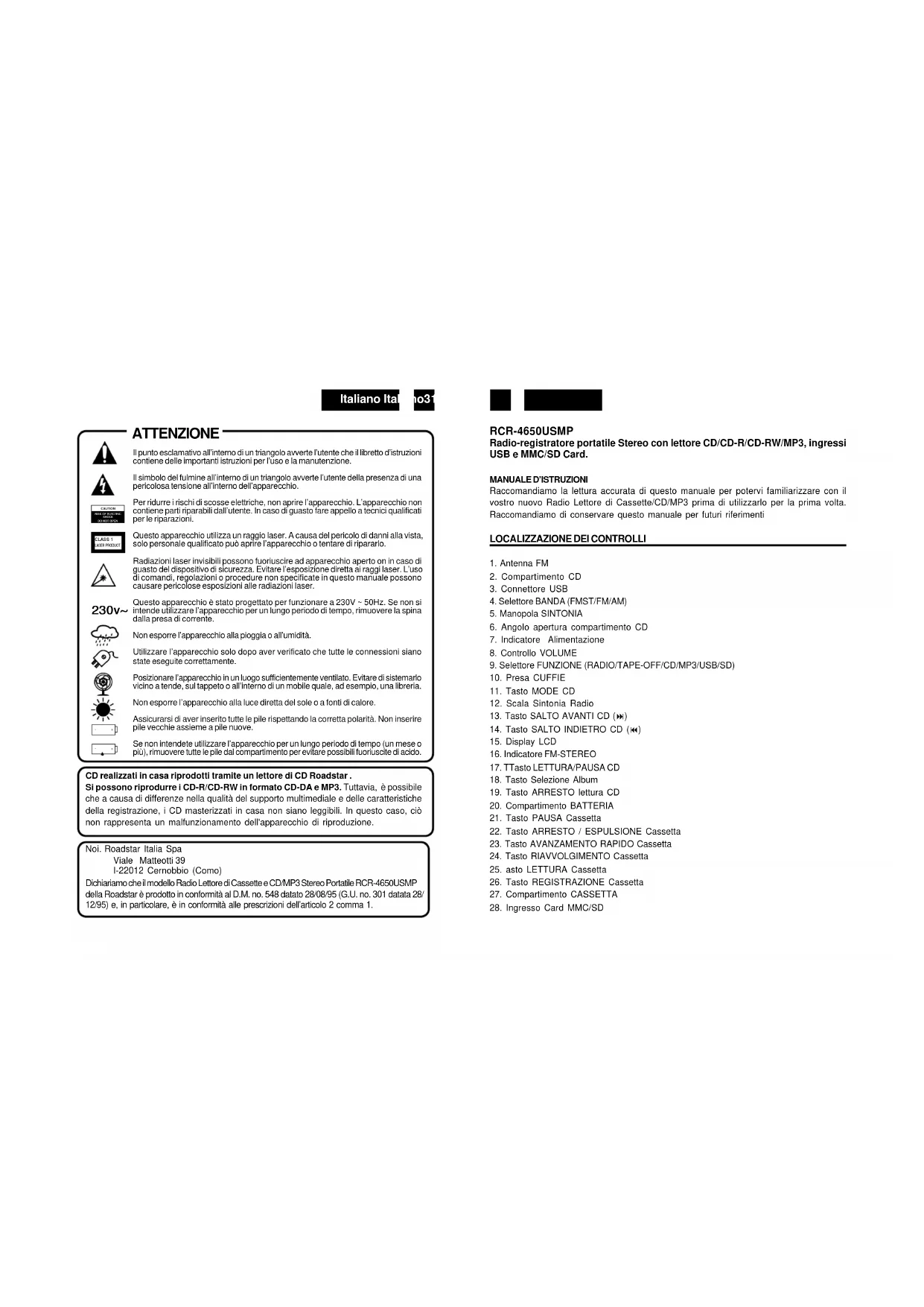 Dichiariamo che il modello Radio Lettore di Cassette e CD/MP3 Stereo Portatile RCR-4650USMP della Roadstar è prodotto in conformità al D.M. no. 548 datato 28/08/95 (G.U. no. 301 datata 28/12/95) e, in particolare, è in conformità alle prescrizioni dell'articolo 2 comma 1.