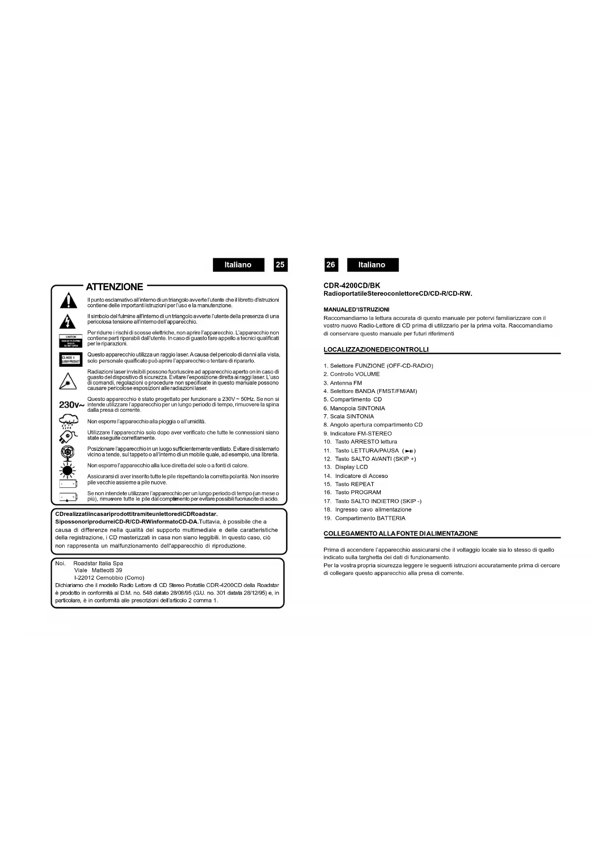 Scarica le istruzioni per il tuo Lettore/registratore cd in formato PDF gratuitamente! Trova il tuo manuale CDR4200CDBK - ROADSTAR e riprendi in mano il tuo dispositivo elettronico. In questa pagina sono pubblicati tutti i documenti necessari per l'utilizzo del tuo dispositivo. CDR4200CDBK del marchio ROADSTAR.