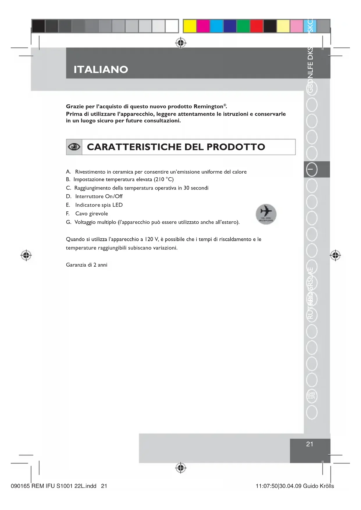 CARATTERISTICHE DEL PRODOTTO A. B. Impostazione temperatura elevata (210 °C)C. Raggiungimento della temperatura operativa in 30 secondiD. Interruttore On/OffE. Indicatore spia LEDF. Cavo girevoleG. Voltaggio multiplo (l’apparecchio può essere utilizzato anche all’estero).Quando si utilizza l’apparecchio a 120 V, è possibile che i tempi di riscaldamento e le temperature raggiungibili subiscano variazioni.Garanzia di 2 anni090165 REM IFU S1001 22L.indd 21 11:07:50|30.04.09 Guido Krölls 5LYHVWLPHQWRLQFHUDPLFDSHUFRQVHQWLUHXQ·HPLVVLRQHXQLIRUPHGHOFDORUHITALIANO