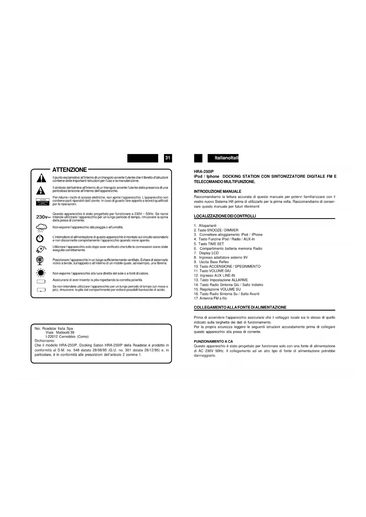 Scarica le istruzioni per il tuo Dock station in formato PDF gratuitamente! Trova il tuo manuale HRA250IPWH - ROADSTAR e riprendi in mano il tuo dispositivo elettronico. In questa pagina sono pubblicati tutti i documenti necessari per l'utilizzo del tuo dispositivo. HRA250IPWH del marchio ROADSTAR.