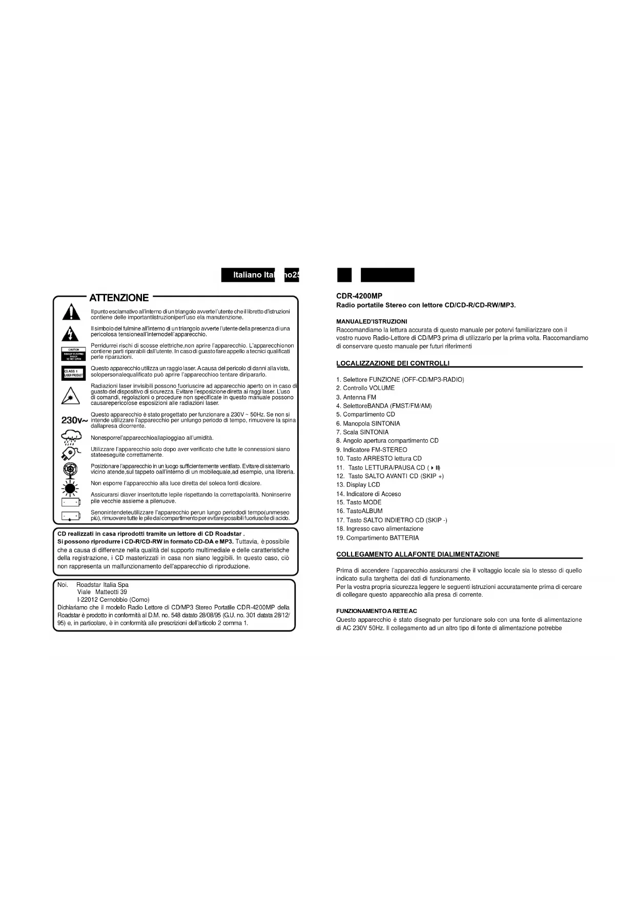 Prima di accendere l’apparecchio assicurarsi che il voltaggio locale sia lo stesso di quello indicato sulla targhetta dei dati di funzionamento. Per la vostra propria sicurezza leggere le seguenti istruzioni accuratamente prima di cercare di collegare questo apparecchio alla presa di corrente. FUNZIONAMENTOARETEAC Questo apparecchio è stato disegnato per funzionare solo con una fonte di alimentazione di AC 230V 50Hz. Il collegamento ad un altro tipo di fonte di alimentazione potrebbe ATTENZIONE Ilpuntoesclamativoall’interno diuntriangoloavvertel’utentecheillibrettod’istruzioni contiene delle importantiistruzioniperl’uso ela manutenzione. Ilsimbolodelfulmineall’internodi untriangolo avvertel’utentedellapresenzadiuna pericolosa tensioneall’internodell’apparecchio.Perridurrei rischi di scosse elettriche,non aprire l’apparecchio. L’apparecchionon contiene partiriparabilidall’utente.In casodi guastofareappelloatecniciqualificati perle riparazioni. Questo apparecchioutilizza unraggiolaser.Acausa del pericolo di danni allavista, solopersonalequalificato può aprire l’apparecchioo tentare diripararlo.Radiazioni laser invisibili possono fuoriuscire ad apparecchio aperto on in caso di guasto del dispositivo di sicurezza. Evitare l’esposizionediretta ai raggi laser. L’uso di comandi, regolazioni o procedure non specificate in questo manuale possonocausarepericolose esposizioni alle radiazioni laser. Questo apparecchio è stato progettato per funzionare a 230V ~ 50Hz. Se non si intende utilizzare l’apparecchio per unlungo periodo di tempo, rimuovere la spinadallapresa dicorrente.Nonesporrel’apparecchioallapioggiao all’umidità. Utilizzare l’apparecchio solo dopo aver verificato che tutte le connessioni siano stateeseguite correttamente. Posizionarel’apparecchioin un luogo sufficientemente ventilato.Evitaredisistemarlo vicino atende,sul tappeto oall’interno di un mobilequale,ad esempio, una libreria.Non esporre l’apparecchio alla luce diretta del soleoa fonti dicalore.Assicurarsi diaver inseritotutte lepile rispettando la correttapolarità. Noninserirepile vecchie assieme a pilenuove.Senonintendeteutilizzare l’apparecchio perun lungo periododi tempo(unmeseo più),rimuoveretutte le piledalcompartimentoperevitarepossibilifuoriuscitediacido. CD realizzati in casa riprodotti tramite un lettore di CD Roadstar . Si possono riprodurre i CD-R/CD-RW in formato CD-DA e MP3. Tuttavia, è possibile che a causa di differenze nella qualità del supporto multimediale e delle caratteristiche della registrazione, i CD masterizzati in casa non siano leggibili. In questo caso, ciò non rappresenta un malfunzionamento dell'apparecchio di riproduzione. Noi. Roadstar Italia Spa Viale Matteotti 39 I-22012 Cernobbio (Como) Dichiariamo che il modello Radio Lettore di CD/MP3 Stereo Portatile CDR-4200MP della Roadstar è prodotto in conformità al D.M. no. 548 datato 28/08/95 (G.U. no. 301 datata 28/12/