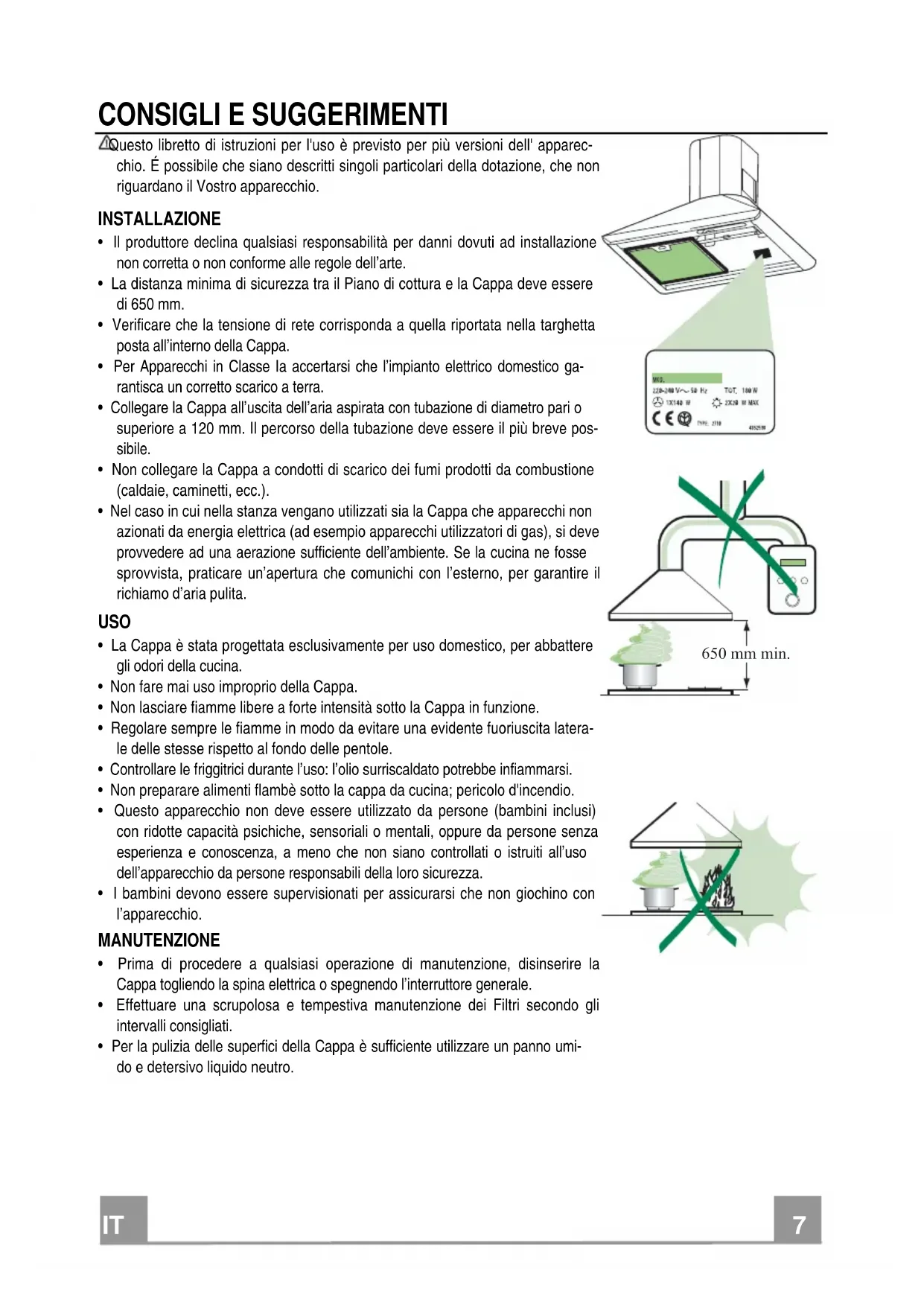 CONSIGLI E SUGGERIMENTI Questo libretto di istruzioni per l'uso è previsto per più versioni dell' apparec-chio. É possibile che siano descritti singoli particolari della dotazione, che non riguardano il Vostro apparecchio. INSTALLAZIONE • Il produttore declina qualsiasi responsabilità per danni dovuti ad installazione non corretta o non conforme alle regole dell’arte. • La distanza minima di sicurezza tra il Piano di cottura e la Cappa deve essere di 650 mm. • Verificare che la tensione di rete corrisponda a quella riportata nella targhetta posta all’interno della Cappa. • Per Apparecchi in Classe Ia accertarsi che l’impianto elettrico domestico ga-rantisca un corretto scarico a terra. • Collegare la Cappa all’uscita dell’aria aspirata con tubazione di diametro pari o superiore a 120 mm. Il percorso della tubazione deve essere il più breve pos-sibile. • Non collegare la Cappa a condotti di scarico dei fumi prodotti da combustione (caldaie, caminetti, ecc.). • Nel caso in cui nella stanza vengano utilizzati sia la Cappa che apparecchi non azionati da energia elettrica (ad esempio apparecchi utilizzatori di gas), si deve provvedere ad una aerazione sufficiente dell’ambiente. Se la cucina ne fosse sprovvista, praticare un’apertura che comunichi con l’esterno, per garantire il richiamo d’aria pulita. USO • La Cappa è stata progettata esclusivamente per uso domestico, per abbattere gli odori della cucina. • Non fare mai uso improprio della Cappa. • Non lasciare fiamme libere a forte intensità sotto la Cappa in funzione. • Regolare sempre le fiamme in modo da evitare una evidente fuoriuscita latera-le delle stesse rispetto al fondo delle pentole. • Controllare le friggitrici durante l’uso: l’olio surriscaldato potrebbe infiammarsi. • Non preparare alimenti flambè sotto la cappa da cucina; pericolo d'incendio. • Questo apparecchio non deve essere utilizzato da persone (bambini inclusi) con ridotte capacità psichiche, sensoriali o mentali, oppure da persone senza esperienza e conoscenza, a meno che non siano controllati o istruiti all’uso dell’apparecchio da persone responsabili della loro sicurezza. • I bambini devono essere supervisionati per assicurarsi che non giochino con l’apparecchio. MANUTENZIONE • Prima di procedere a qualsiasi operazione di manutenzione, disinserire la Cappa togliendo la spina elettrica o spegnendo l’interruttore generale. • Effettuare una scrupolosa e tempestiva manutenzione dei Filtri secondo gli intervalli consigliati. • Per la pulizia delle superfici della Cappa è sufficiente utilizzare un panno umi-do e detersivo liquido neutro.