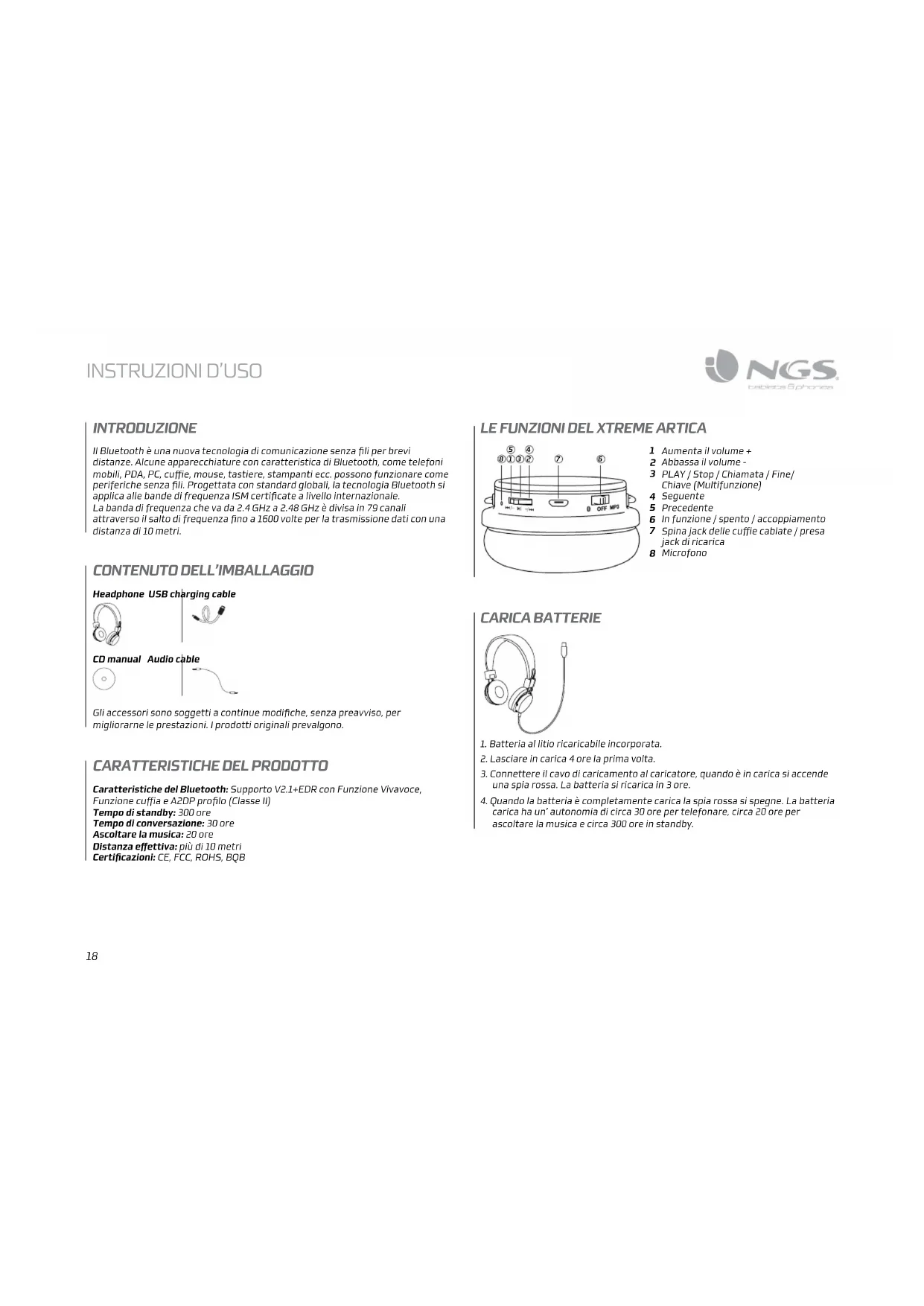 INSTRUZIONI D’USO INTRODUZIONE CONTENUTO DELL’IMBALLAGGIO CARICA BATTERIE LE FUNZIONI DEL XTREME ARTICA Il Bluetooth è una nuova tecnologia di comunicazione senza fili per brevi