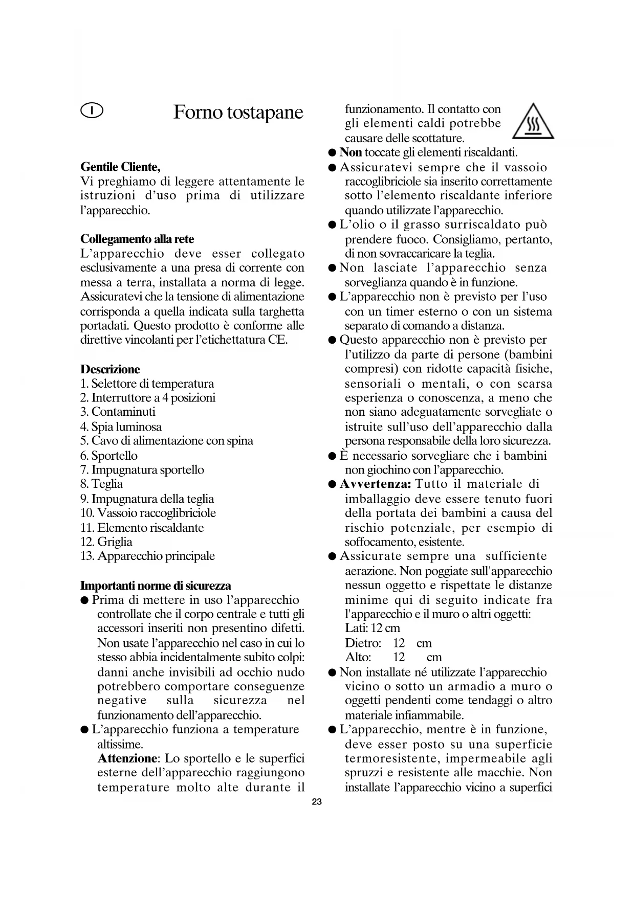 Attenzione: Lo sportello e le superfici esterne dell'apparecchio raggiungono temperature molto alto durante il
