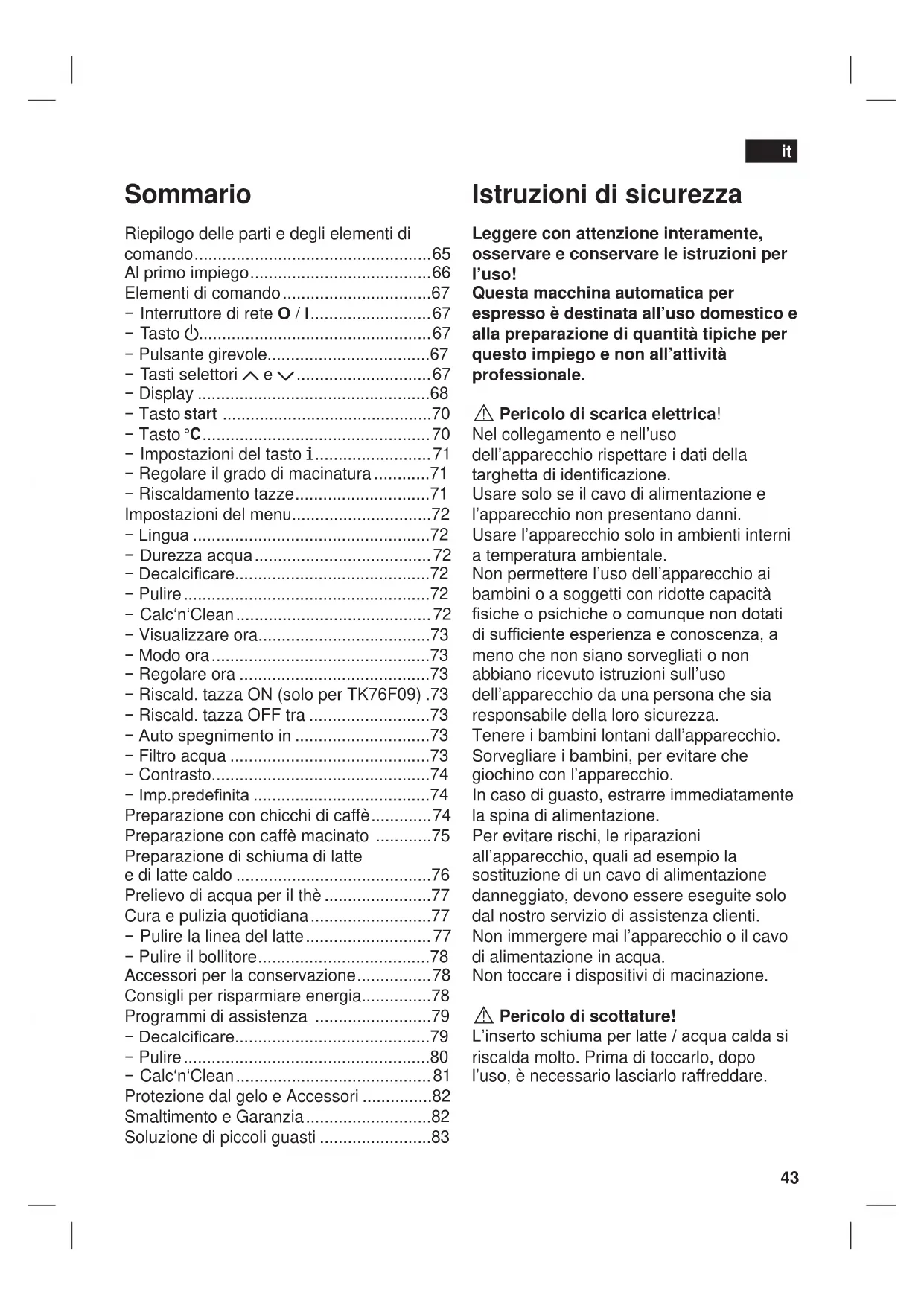 Accessori I seguenti accessori generalmente sono disponibile presso i rivenditore e presso il servizio clienti.Codice ordinazioneRiven- ditoriServizio clientiPastiglie di puliziaTZ60001 310575PastigliedecalcificantiTZ60002 310967Filtro acqua TZ70003 467873 Smaltimento A Questo apparecchio è contrassegnato conformemente alla Direttiva europea 2002/96/CE Riuti di apparecchiature elettriche ed elettroniche (waste electrical and electronic equipement-WEEE). La direttiva stabilisce il quadro generale per un ritiro e recupero valido in tutta I‘UE. Informarsi presso il rivenditore specializzato sulle attuali disposizioni per la rottamazione. Garanzia Per questo apparecchio sono valide le condizioni di garanzia pubblicate dal nostro rappresentante nel paese di vendita. Il rivenditore, presso il quale è stato acquistato l’apparecchio, è sempre ben disposto a fornire a richiesta informazioni a proposito. Per l’esercizio del diritto di garanzia è comunque necessario presentare il documento di acquisto. Con riserva di modica.62