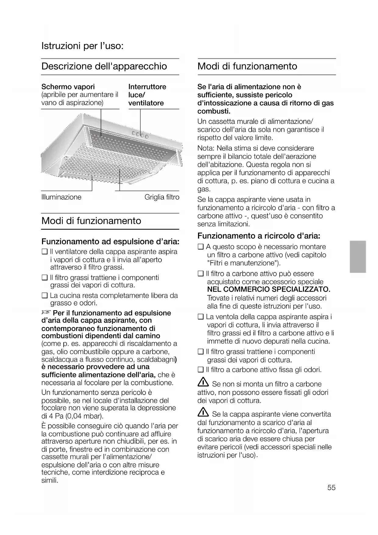 Modi di funzionamento Se l'aria di alimentazione non è sufficiente, sussiste pericolo d'intossicazione a causa di ritorno di gascombusti.Un cassetta murale di alimentazione/scarico dell'aria da sola non garantisce ilrispetto del valore limite.Nota: Nella stima si deve considerare sempre il bilancio totale dell'aerazione dell'abitazione. Questa regola non si applica per il funzionamento di apparecchidi cottura, p. es. piano di cottura e cucina a gas. Se la cappa aspirante viene usata infunzionamento a ricircolo d'aria - con filtro acarbone attivo -, quest'uso è consentitosenza limitazioni. Funzionamento a ricircolo d'aria: ❑ A questo scopo è necessario montareun filtro a carbone attivo (vedi capitolo"Filtri e manutenzione").❑ Il filtro a carbone attivo può essere acquistato come accessorio speciale NEL COMMERCIO SPECIALIZZATO.Trovate i relativi numeri degli accessori alla fine di queste istruzioni per l'uso.❑ La ventola della cappa aspirante aspira ivapori di cottura, li invia attraverso il filtro grassi ed il filtro a carbone attivo e liimmette di nuovo depurati nella cucina.❑ Il filtro grassi trattiene i componenti grassi dei vapori di cottura.❑ Il filtro a carbone attivo fissa gli odori. Se non si monta un filtro a carbone attivo, non possono essere fissati gli odoridei vapori di cottura. Se la cappa aspirante viene convertita dal funzionamento a scarico d'aria al funzionamento a ricircolo d'aria, l'aperturadi scarico aria deve essere chiusa per evitare pericoli (vedi accessori speciali nelleistruzioni per l'uso) . IlluminazioneInterruttoreluce/ventilatoreGriglia filtroSchermo vapori (apribile per aumentare ilvano di aspirazione) Descrizione dell'apparecchio