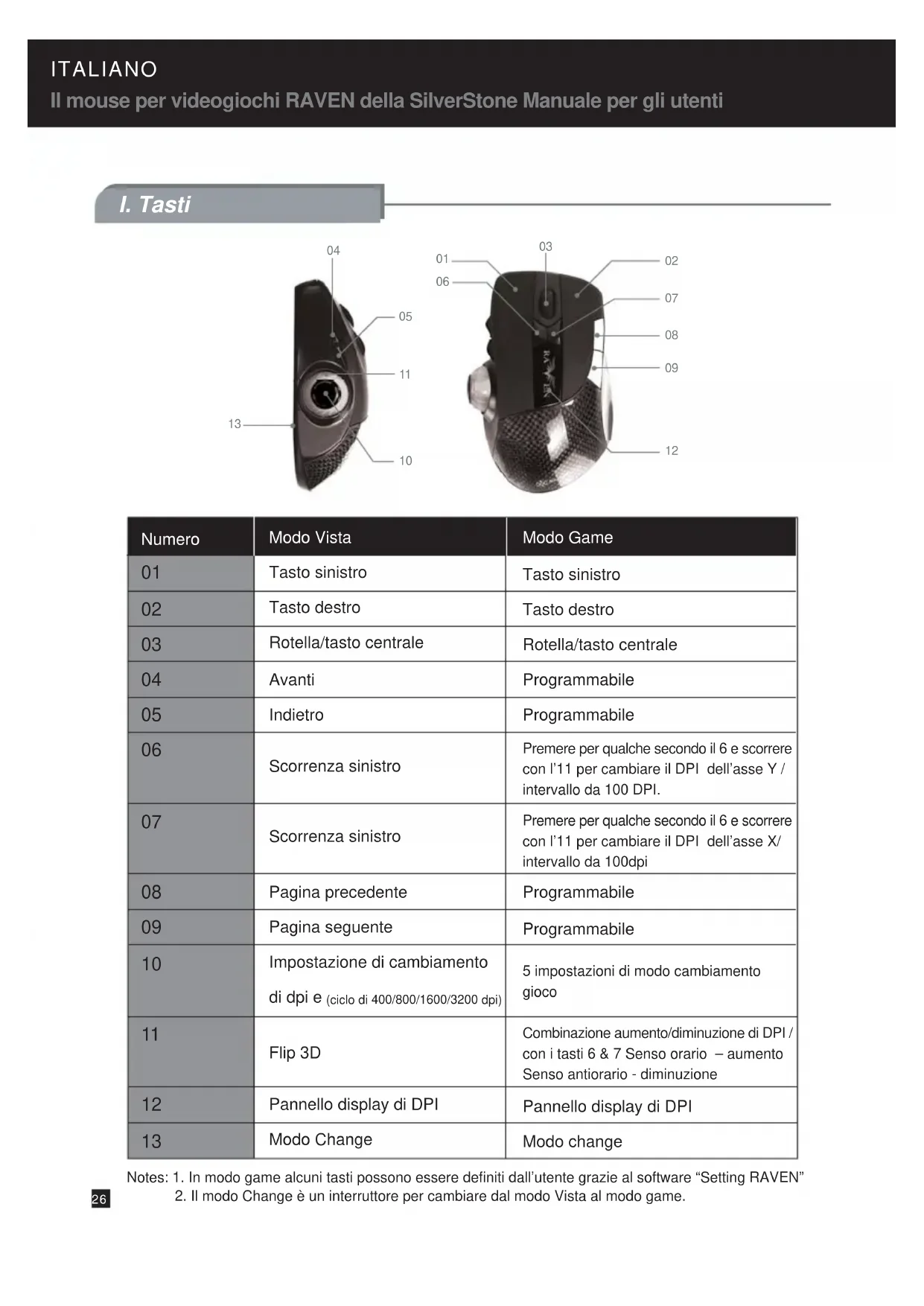 Modo Vista Tasto sinistro Tasto destro Rotella/tasto centrale Avanti Indietro Scorrenza sinistro Scorrenza sinistro Pagina precedente Pagina seguente Impostazione di cambiamento di dpi e (ciclo di 400/800/1600/3200 dpi) Flip 3D Pannello display di DPI Modo Change Notes: 1. In modo game alcuni tasti possono essere definiti dall’utente grazie al software “Setting RAVEN”