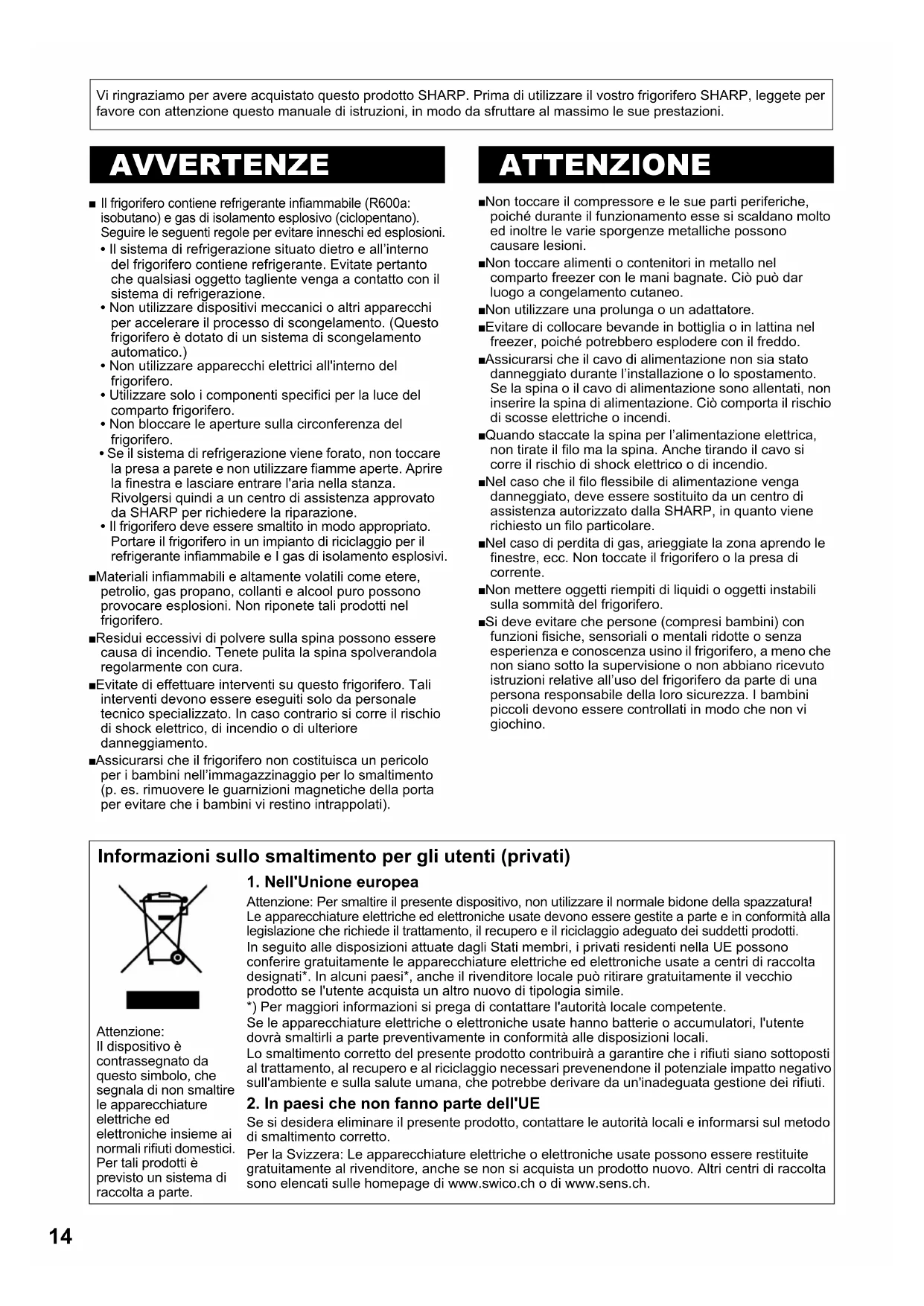- Se ilsystemadi refrigerazionevieneforato,nontoccare la presa aparete e nonutilizzarefiammeaperte.Aprire la finestra e lasciare entrare l'aria nellastanza. Rivolgersi quindo a un centro di assistenza approvato da SHARP per richiedere la riparazione.