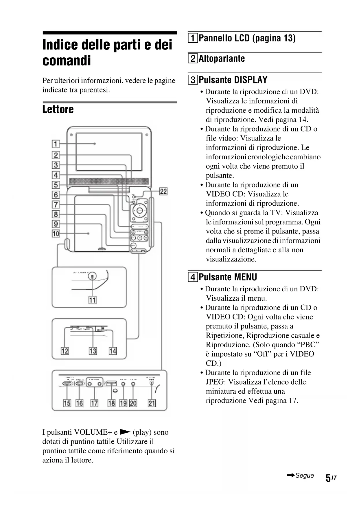 Sistema Laser: a semiconduttoreSistema del formato del segnale: PAL (NTSC)Standard per la trasmissione: DVB-TCopertura del canale digitale: VHF/UHF Uscita VIDEO (uscita video): MinijackUscita 1,0 Vp-p/75 ohmAUDIO (uscita audio)Minijack stereoUscita 2,0 Vrms/47 kilohmImpedenza di carico consigliata oltre 47 kilohmPHONES (cuffie) A/B:Minijack stereo USB: Presa USB Tipo A (Per il collegamento di memorie USB)DIGITAL AERIAL IN: Terminal esterno da 75 ohm per VHF/UHF Display a cristalli liquidi Dimensione schermo: larghezza 7 pollici (diagonale)Sistema di comando: Matrice attiva TFT Risoluzione: 480 × 234 (tasso pixel effettivo: superiore a 99,99%) Generale Requisiti di alimentazione:CC 9,5 V (adattatore di rete CA/adattatore per batteria d’auto)CC 7,4 V (batteria ricaricabile)Consumo energetico (riproduzione DVD VIDEO):7 W (utilizzo con cuffie) Dimensioni (appr.): 200 × 39,5 × 155 mm (larghezza/altezza/ profondità) incl. scanalature batteriaPeso (appr.): 880 g Temperatura di esercizio: da 5 ° C a 35 ° C Umidità di esercizio: da 25 % a 80 %Adattatore di rete CA: 110-240 V AC, 50/60 HzAdattatore per batteria d’auto: 12 V CC Accessori in dotazione Vedi pagina 10.Modello e specifiche sono soggette a modifiche senza preavviso. ALL